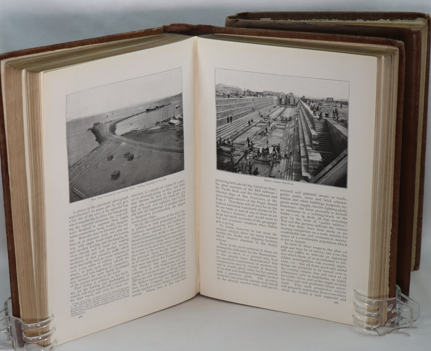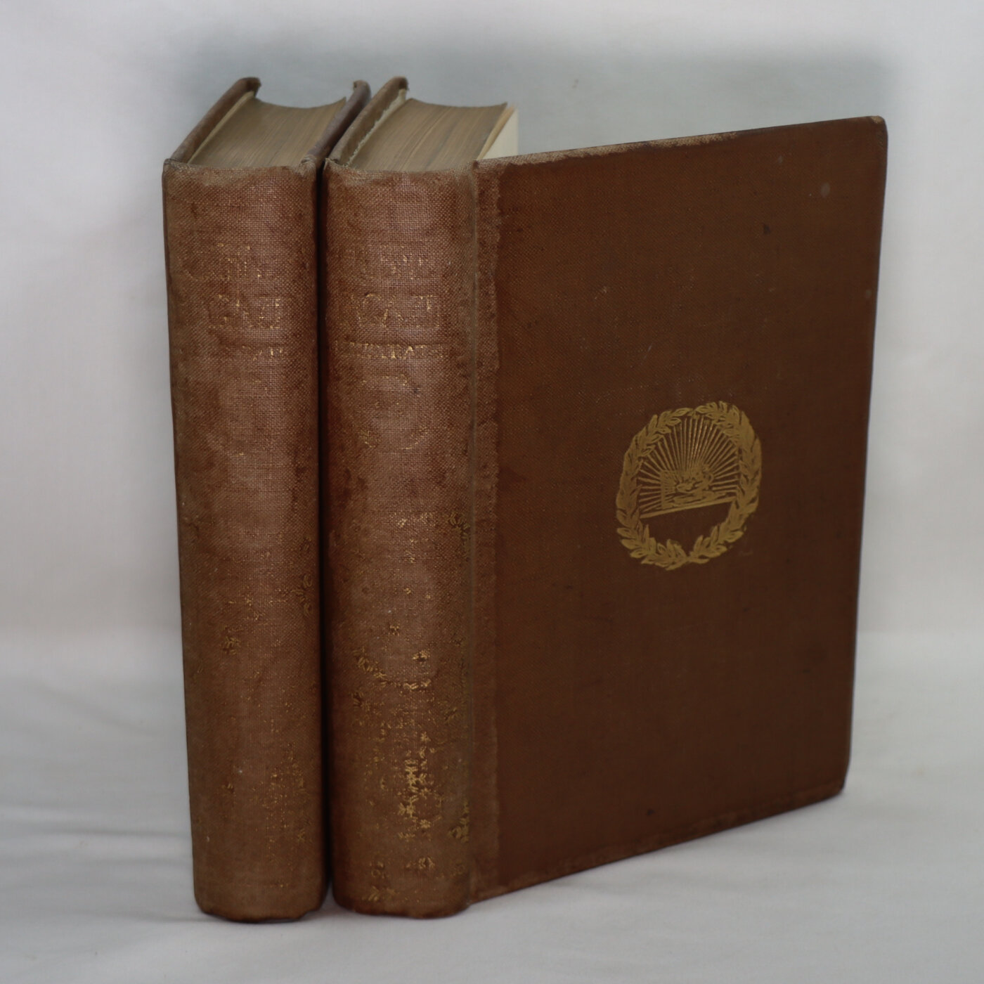 Tan cloth binding with gilt title on the spine. Gilt emblem on the front board. Dimensions are for one volume.