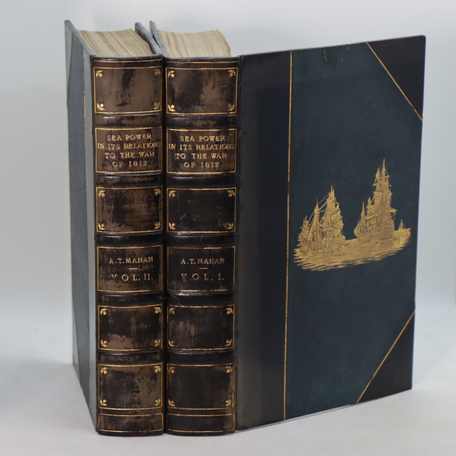 Navy leather spine with textured boards. Gilt shipping engraving on both front boards. Gilt banded rectangles and lettering on the spine. Gilt top edges.
