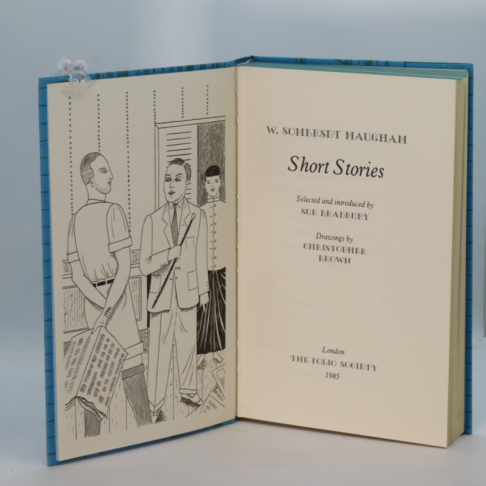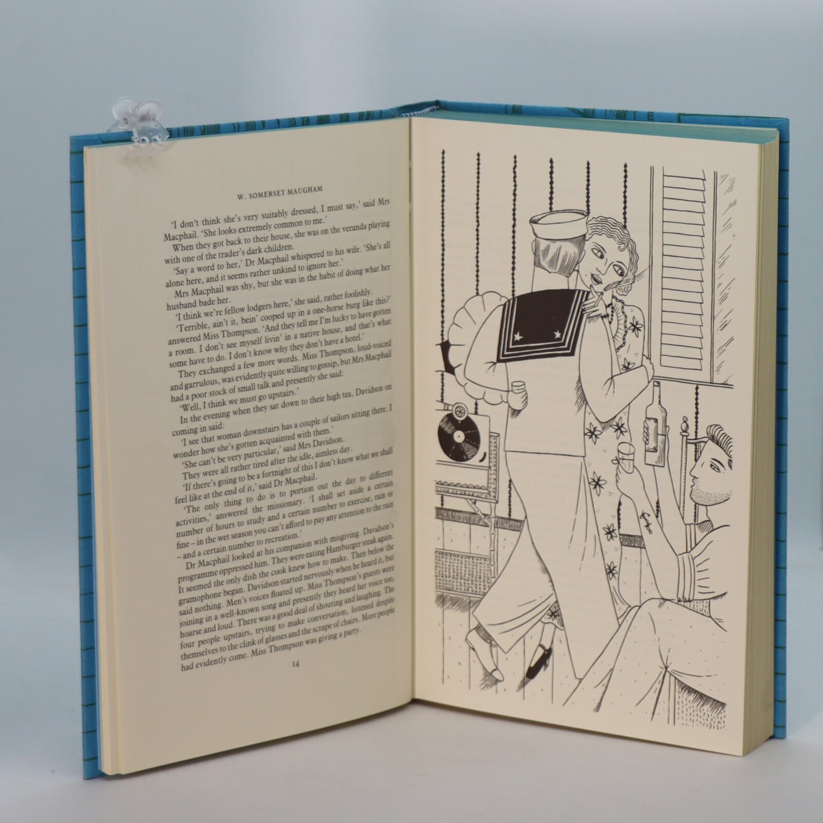 In a fitted box. Blue cloth binding with green palm tree image from a porch. Gilt title on the spine.