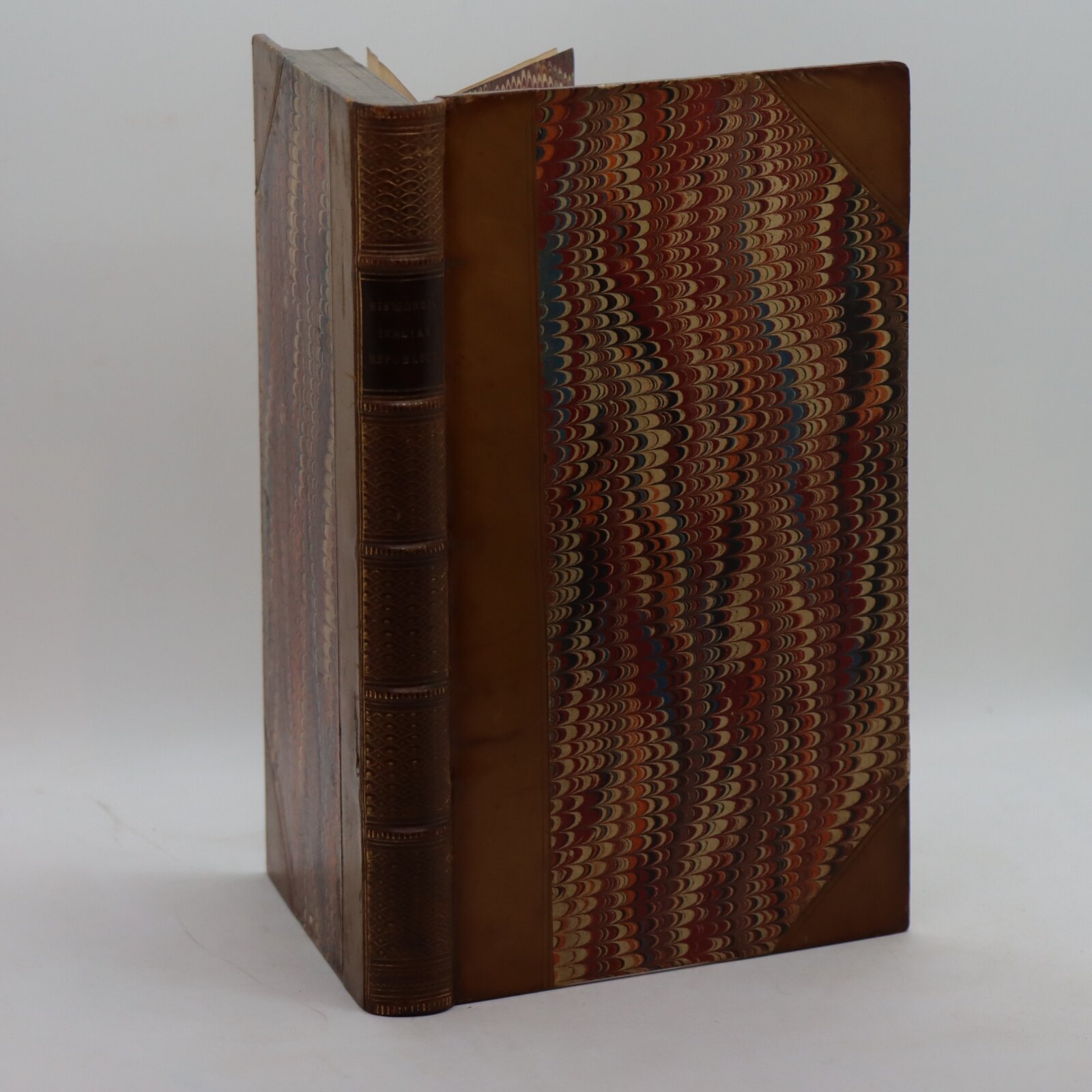 Tan calf spine and corners. Red marbled boards. Embossed title and spine.