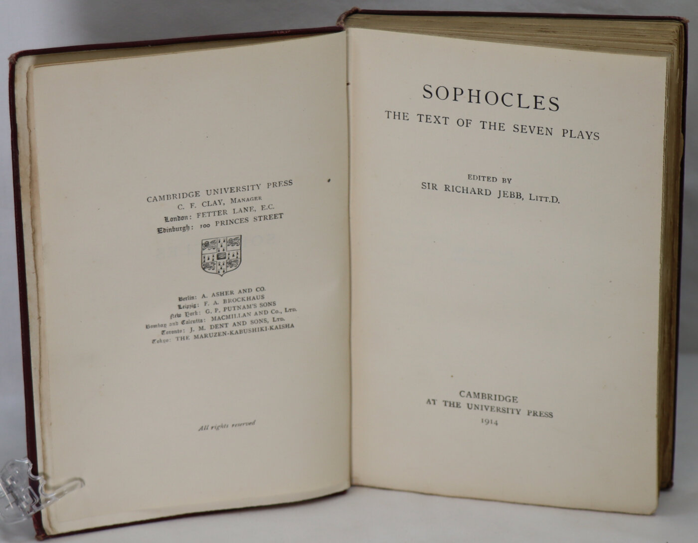 A well kept edition providing one of the best analyses ever of Sophocles. This volume is tidy, still very readable and given its age and use remains a very fulsome book (see photographs for further details).
