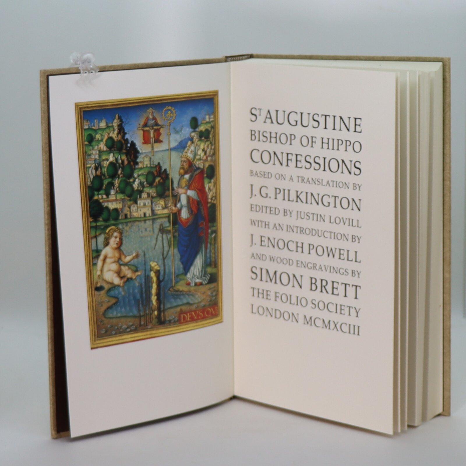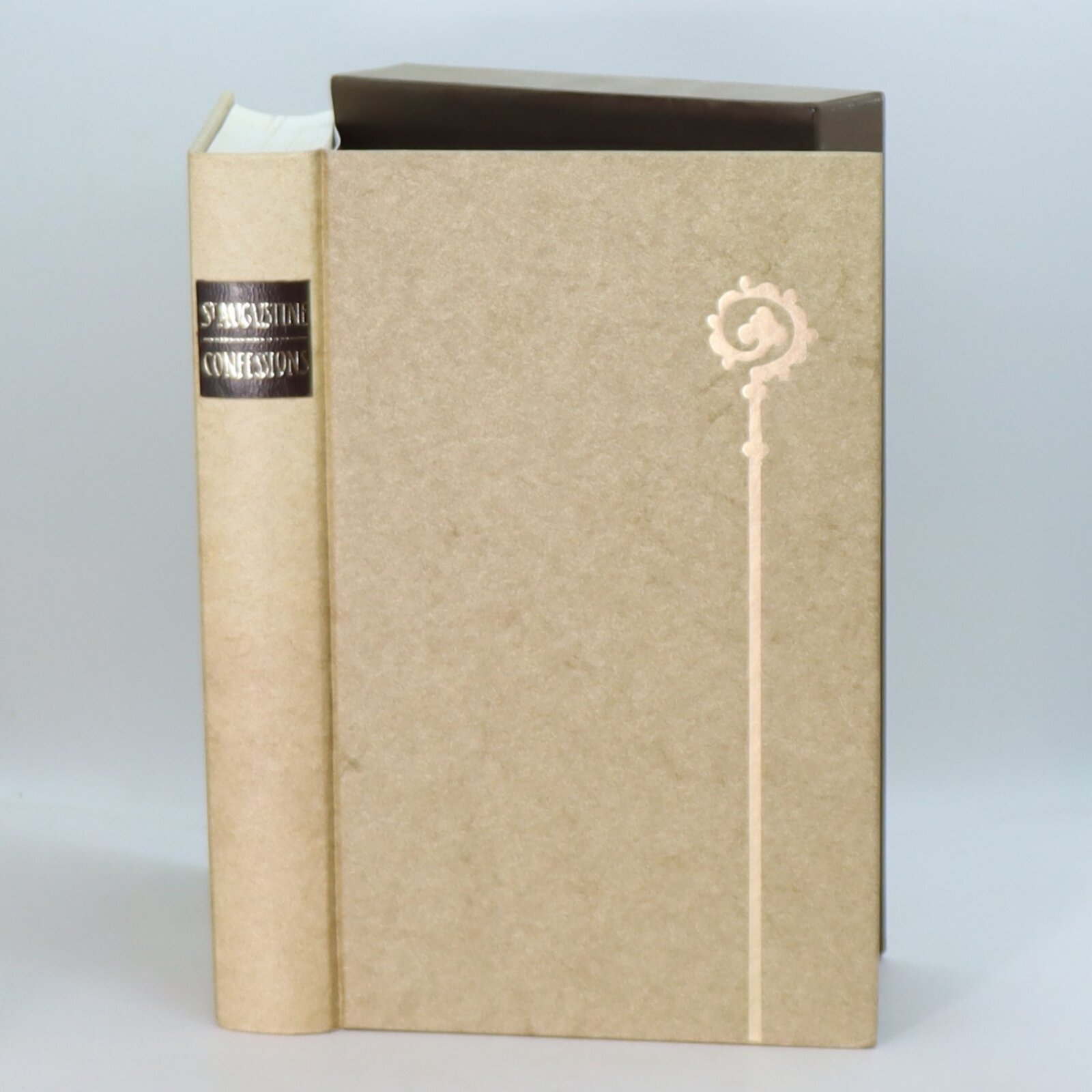 In a fitted box. Tan binding with black title plate and gilt lettering. Gilt cardinal’s crook on front board.
