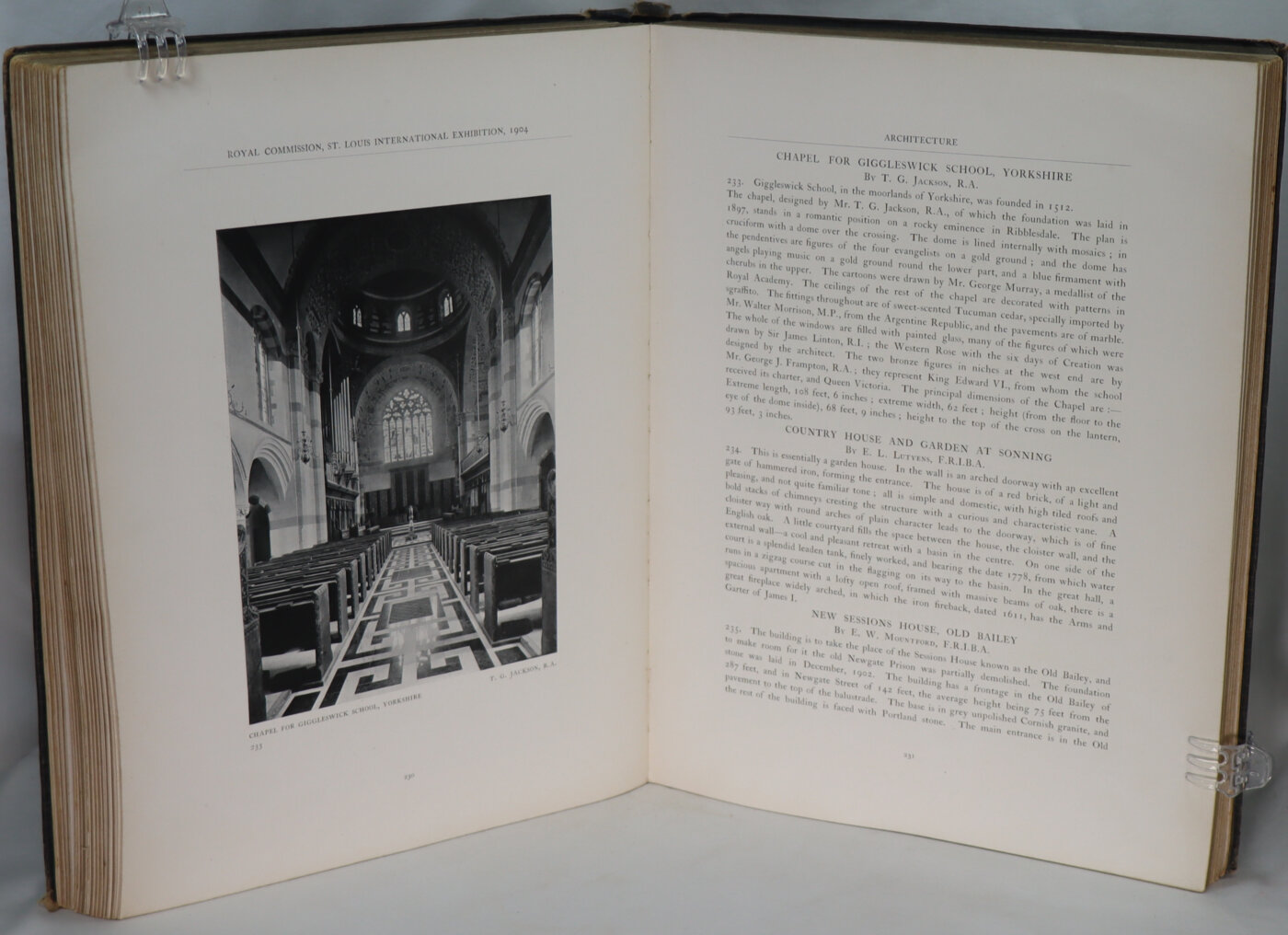 SPIELMANN, Sir Isidore. Royal Commission St. Louis International Exhibition 1904. The British Section. London: Issued by the Royal Commission, 1906. 2o. Photographic illustrations. Original cloth. — Weltausstellung St. Louis 1904. Österreich K. k. Ministerium für Kultus und Unterricht Austellung k. k. kunstgewerblicher Lehranstalten. Vienna, 1904. 4o. Photographic illustrations. Original wrappers — The Universal Exposition of 1904. St. Louis, 1903. 2o. Photographic illustrations. Original limp cloth. — Report of Board of Lady Managers Louisiana Purchase Exposition. N.p., 1905. 8o. Plates. Original cloth. — HANSON, John Wesley. The Official History of the Fair St. Louis, 1904. The Sights and Scenes of the Louisiana Purchase Exposition. N.p., 1904. 8o. Photographic illustrations. Original cloth. — The World’s Work. The St. Louis Exposition. August Number 1904. New York, 1904. 8o. Photographic illustrations. Original limp leather. LIMITED EDITION, number 477 of 750 copies. — FRANCIS, David R. The Universal Exposition of 1904. St. Louis, 1913. 2 volumes, 4o. Vol. 2 with photographic plates. Original cloth. — Another copy of vol. 2 only. — FLETCHER, H. Phillips. The St. Louis Exhibition. 1904. London, 1905. 8o. Photographic plates. Original cloth.