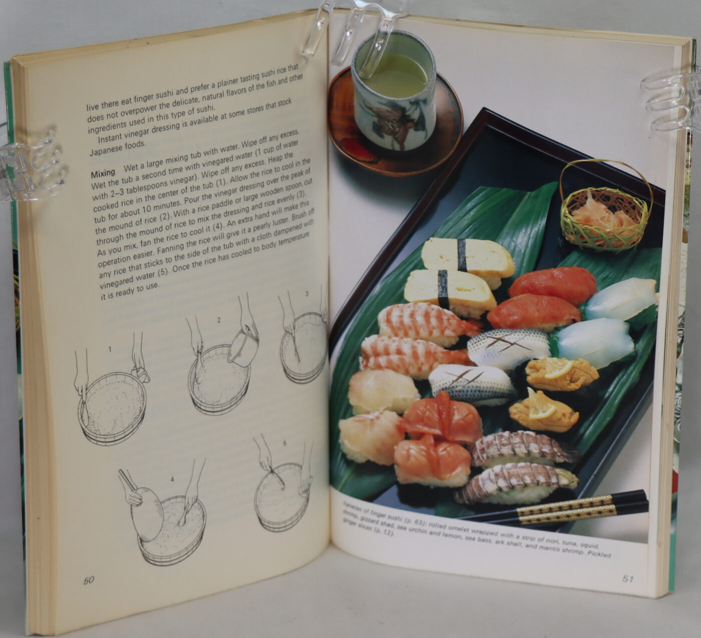 Paperback. Blue cover with red title and sushi Image.