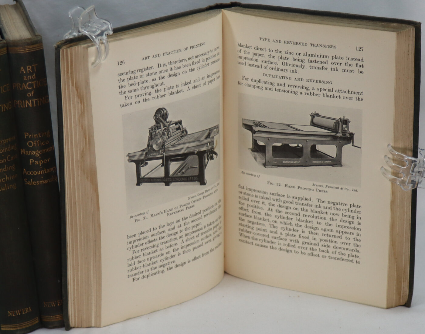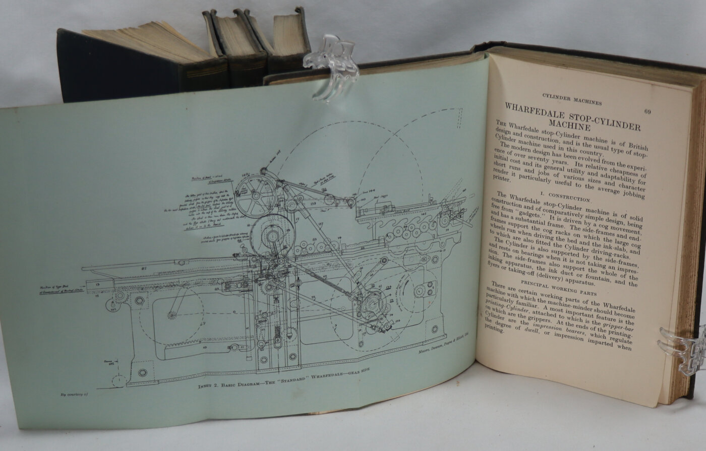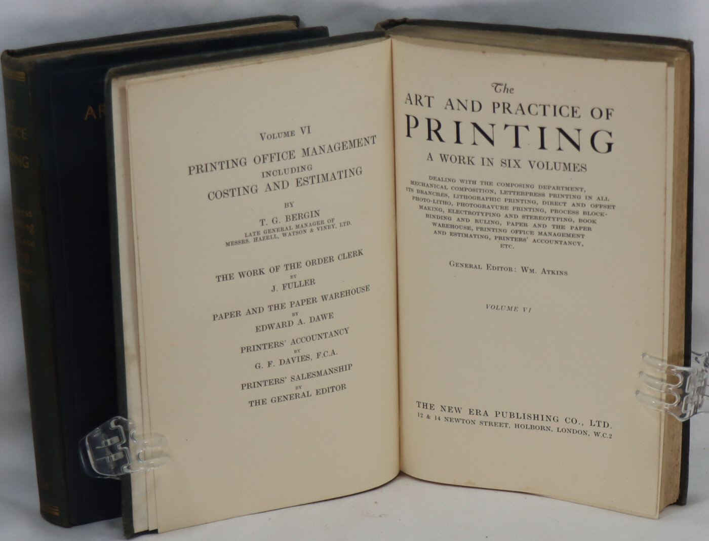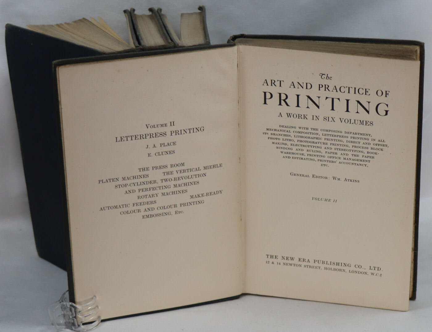 This work covers all aspects of printing, letterpress, lithographic printing, direct and off-set, photo litho, photogravure printing etc. with several black and white illustrations of machinery used in the printing business, some folding charts and plates, color illustrations. Bound in green cloth lettered in gilt, spines lettered in gilt, volume two with two plates loose and upper board with crease. A very good set of this work on the various printing methods and a great teaching tool.