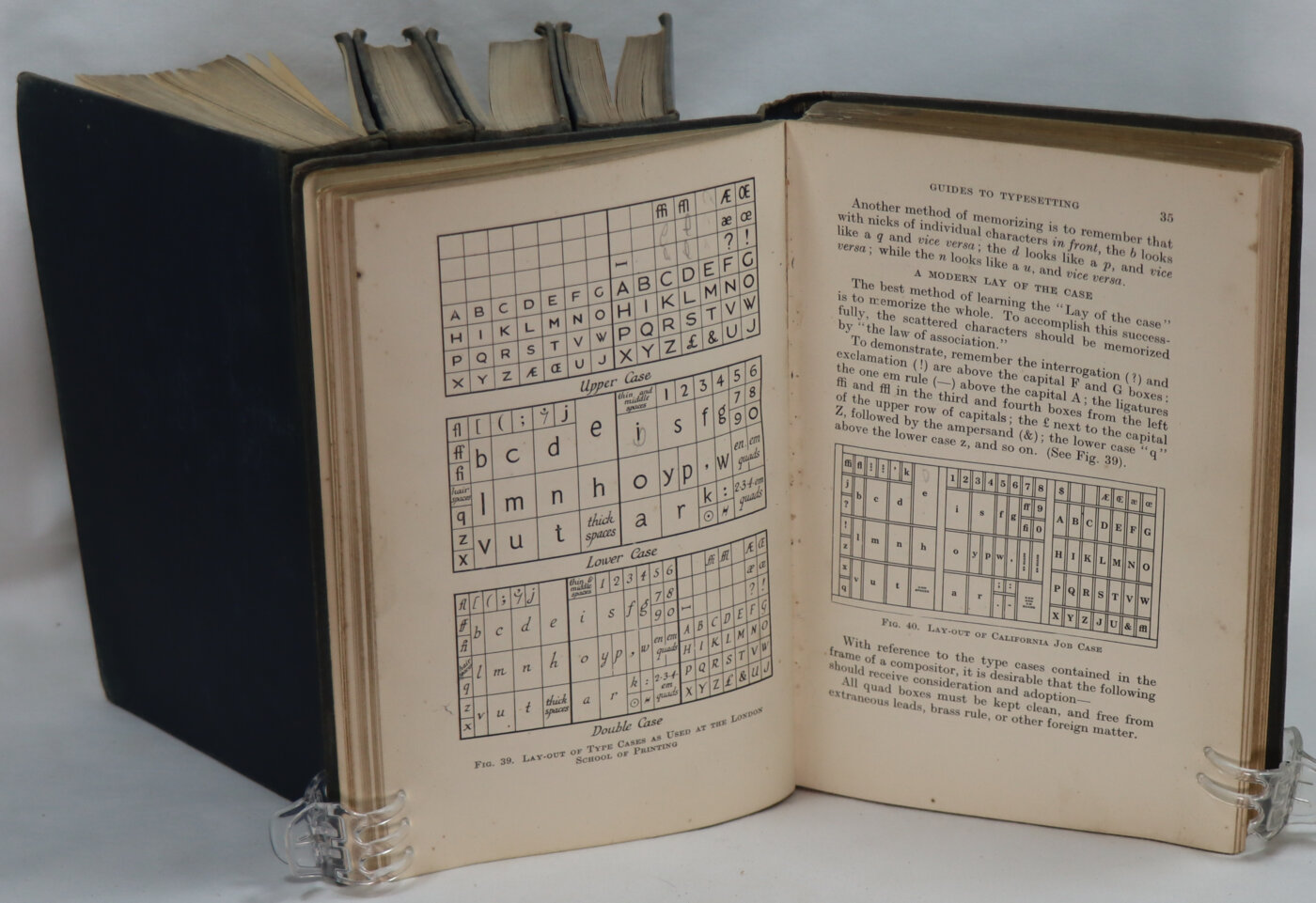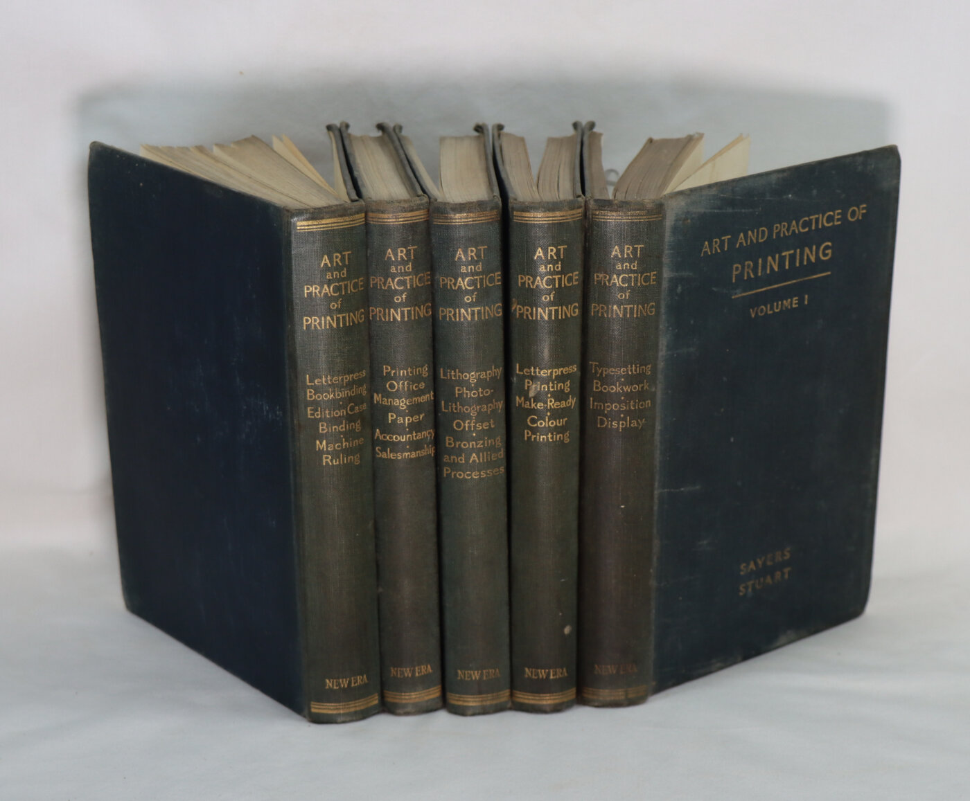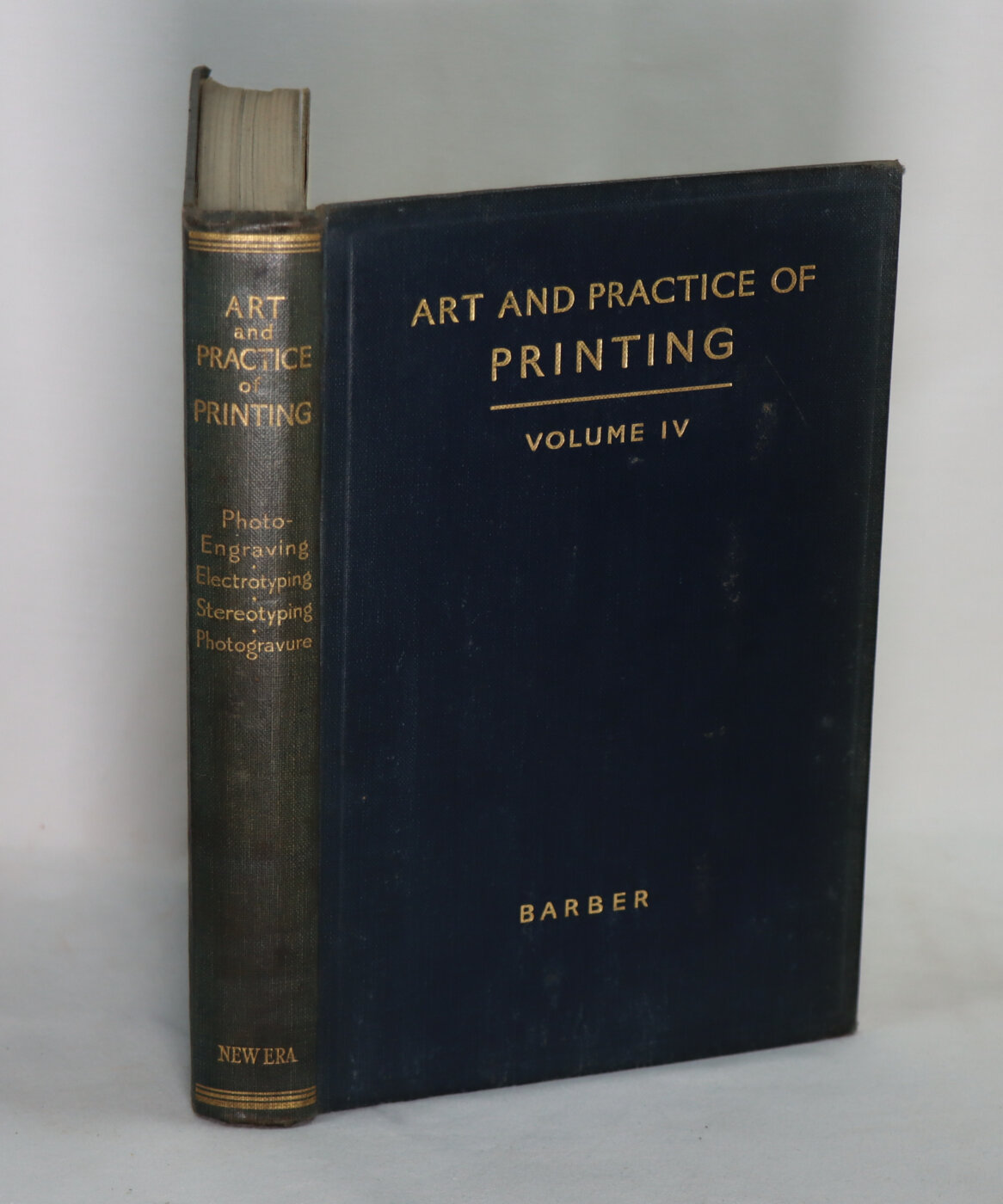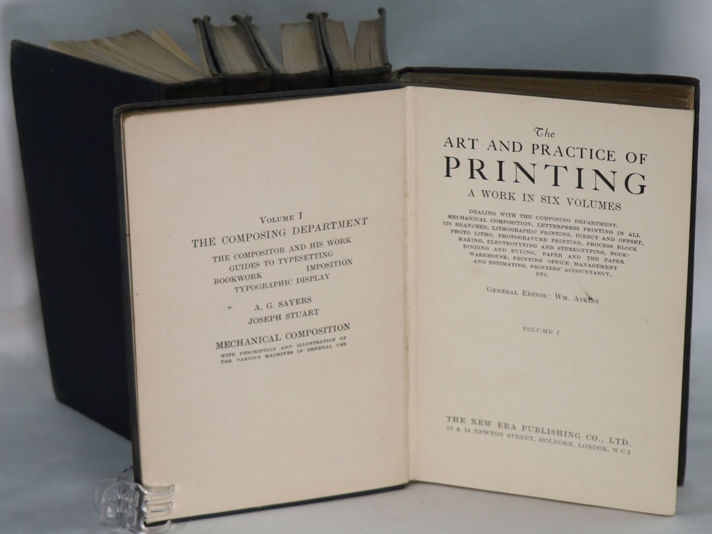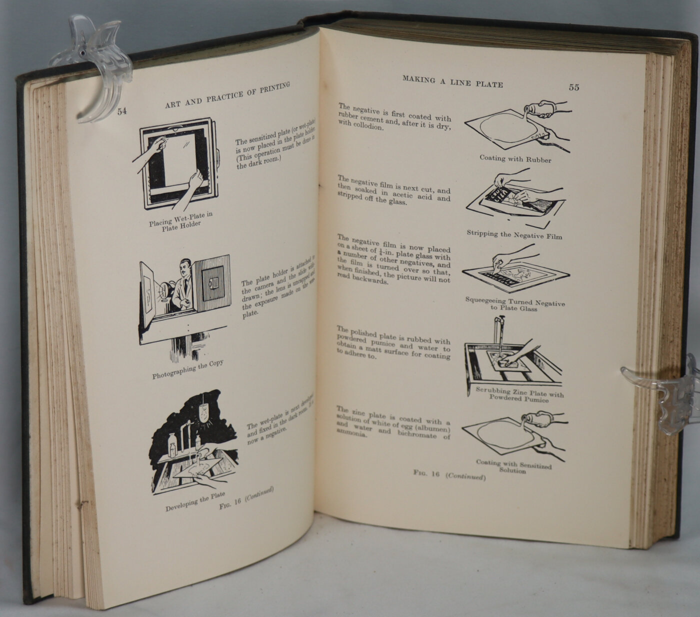 This work covers all aspects of printing, letterpress, lithographic printing, direct and off-set, photo litho, photogravure printing etc. with several black and white illustrations of machinery used in the printing business, some folding charts and plates, color illustrations. Bound in green cloth lettered in gilt, spines lettered in gilt, volume two with two plates loose and upper board with crease. A very good set of this work on the various printing methods and a great teaching tool.
