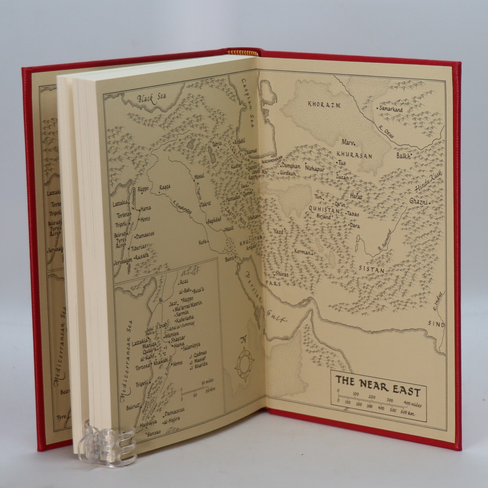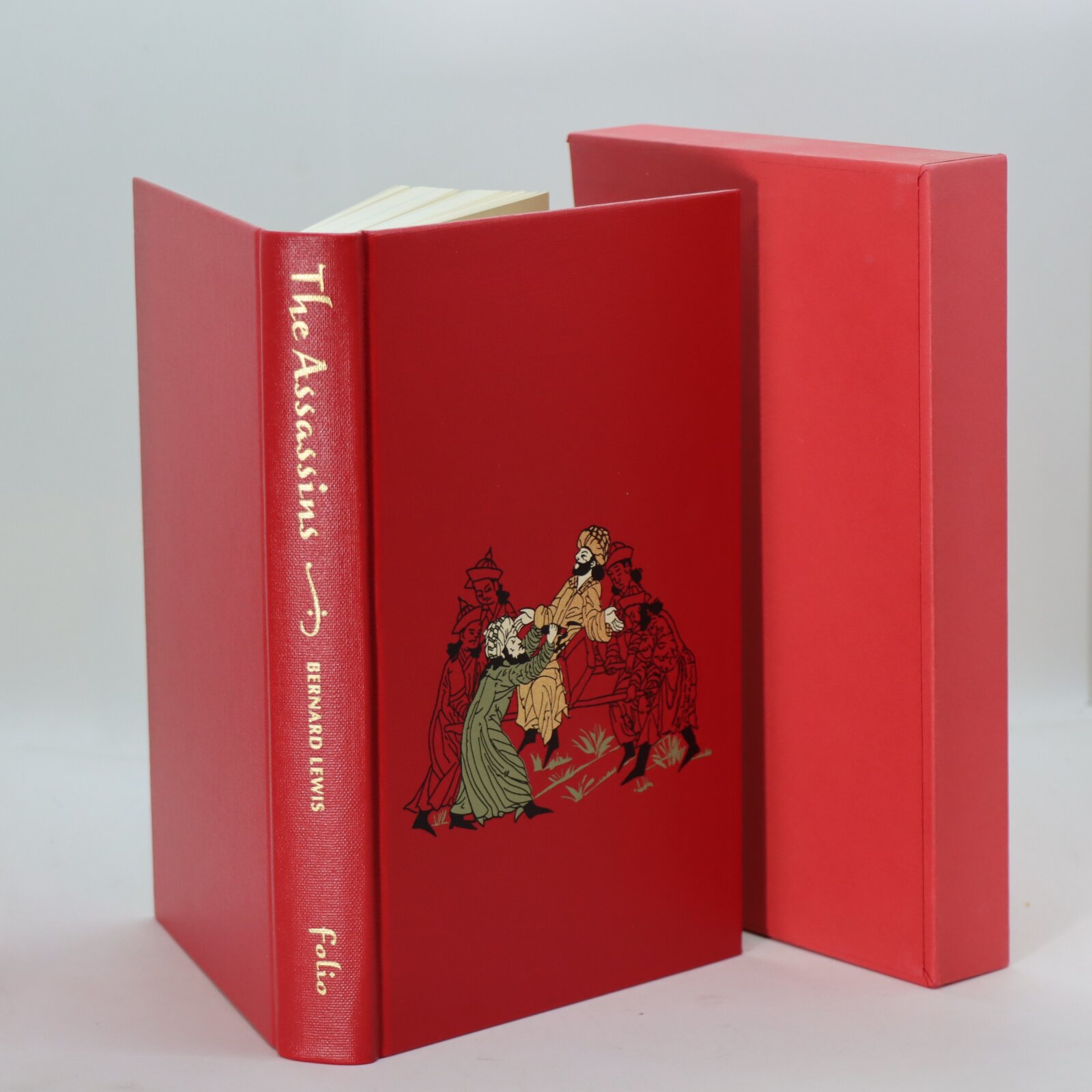Red cloth binding with gilt title on the spine. Black gold and green image of six figures on the front board.