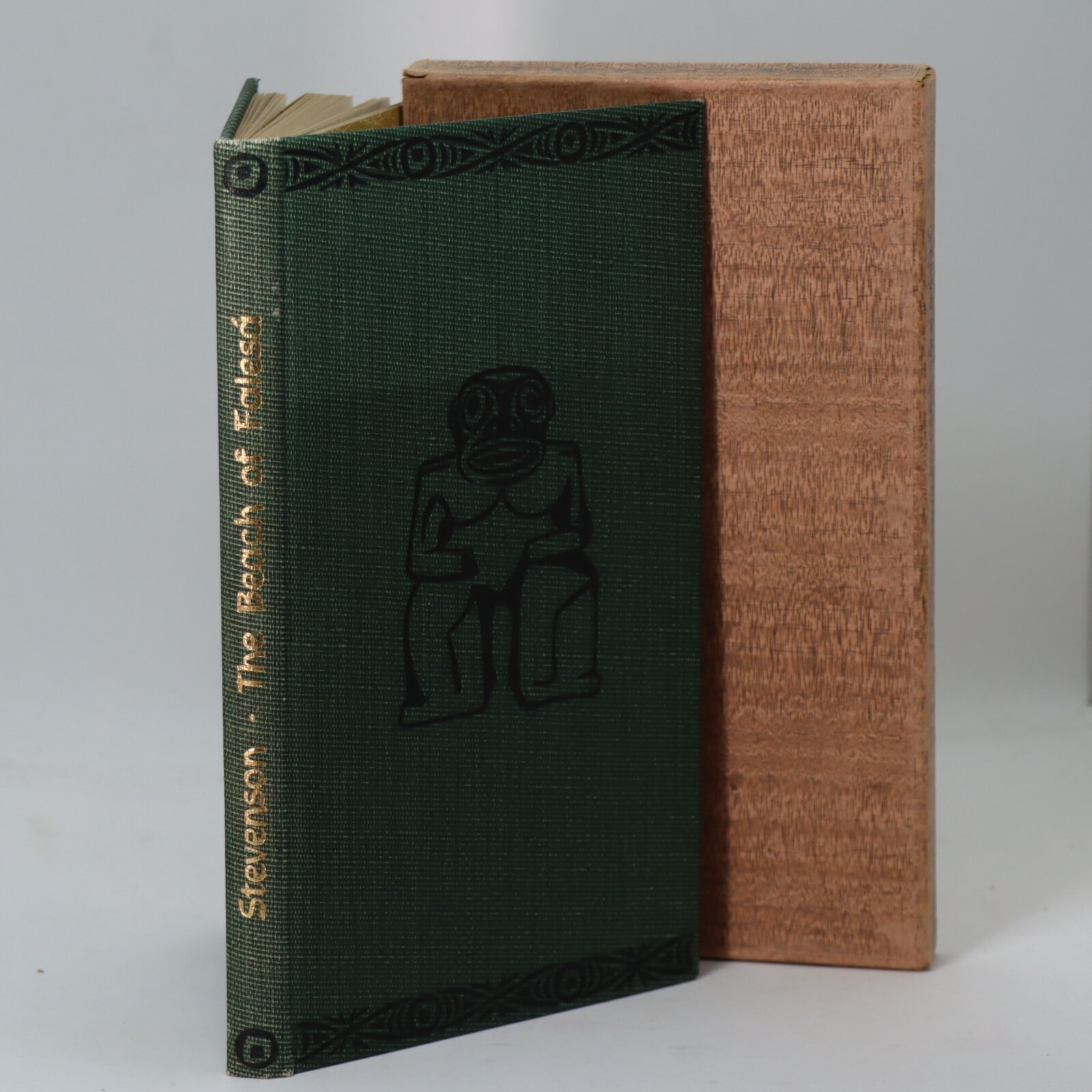 In a fitted box. Dark green cloth binding with gilt title on the spine. Back embossed seated figure, also pattern on top and bottom edges of front board.