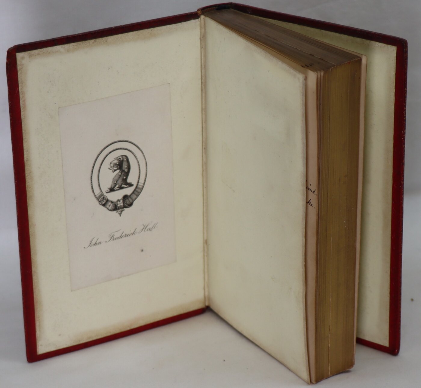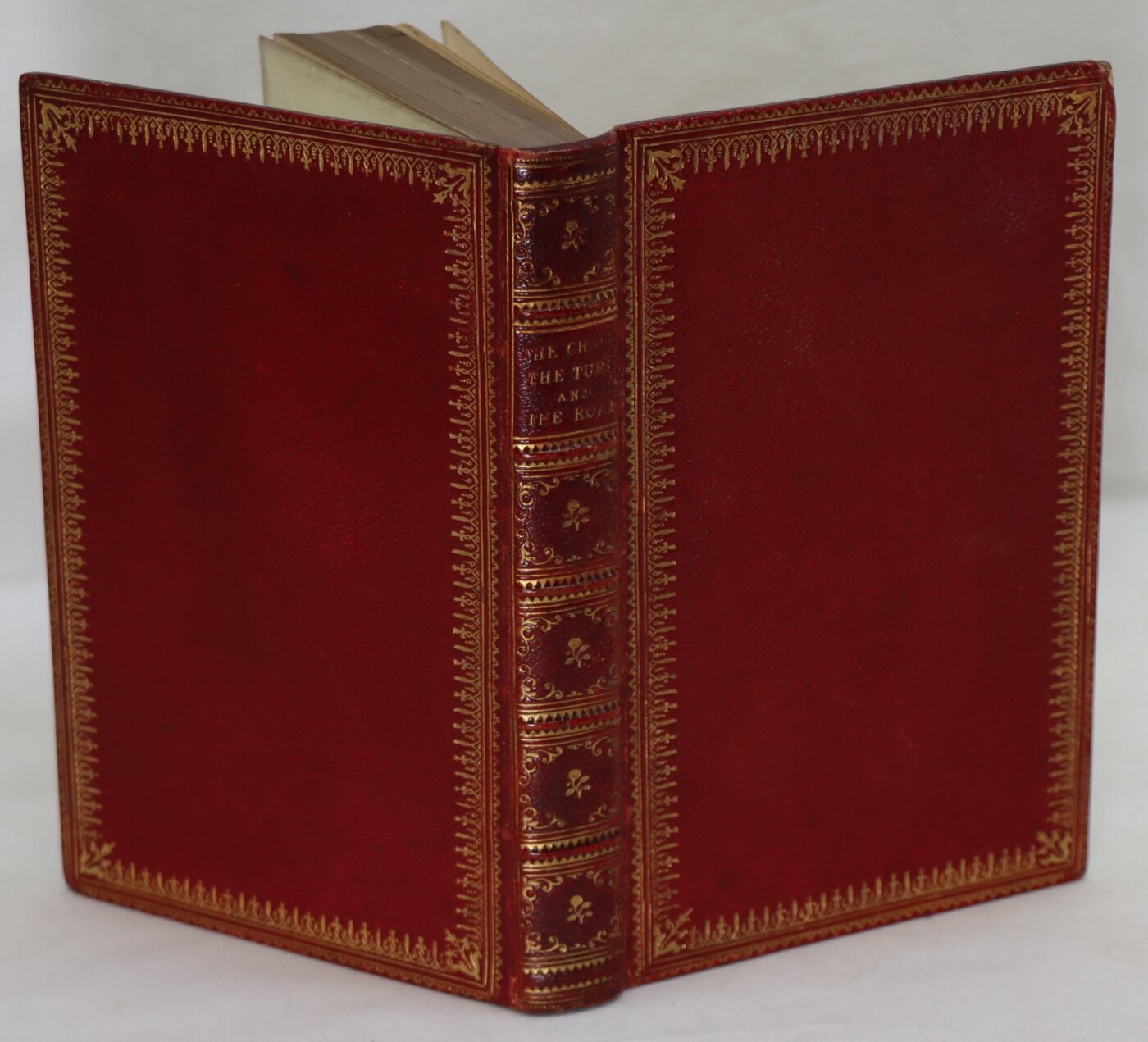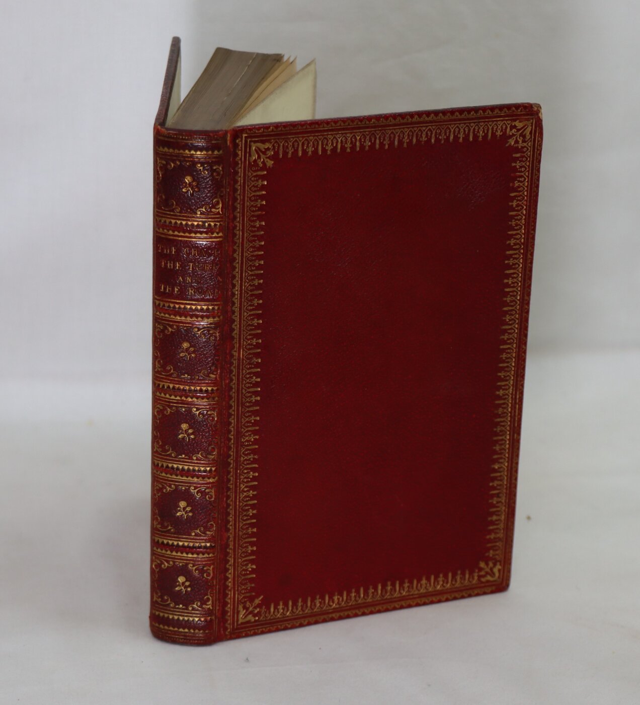 Red calf binding with gilt banding, decoration and title on the spine. Decorative edging on the front board.