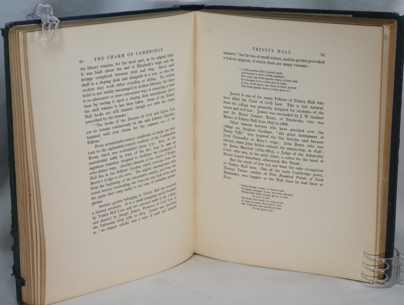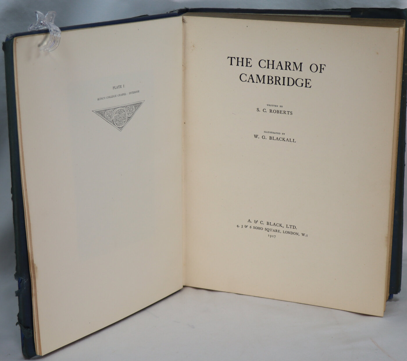 Cloth. Condition: Very Good Indeed. Gordon Home; Frank Greenwood; W. G. Blackall (illustrator). First edition. A fascinating and beautifully illustrated volumes from A. and C. Black’s ‘The “Charm” Series’; complete with the original dust wrappers. A. and C. Black were a renowned British book publishing company best known for their influential ‘Black’s Guides’ series, that was characterised through their coherent and “colloquial” style and lack of “cultural pretension”. Beyond their small and succinct travel guides, A. and C. Black published a large array of works, including this beautifully illustrated series on counties in England: ‘The “Charm” Series’. This series was characterised by their idyllic studies of little-known ‘beauty-spots, ancient places, and pilgrim’s paths’, and for featuring twenty four illustrated plates reproduced from pencil drawings by a variety of renowned artists and illustrators. ‘The Charm of Cambridge’ was written by Sir Sydney Castle Roberts, a British author, publisher and popular figure around Cambridge, with illustrations by W. G. Blackall. Externally excellent, with only minor shelf wear to extremities. Very Good book.