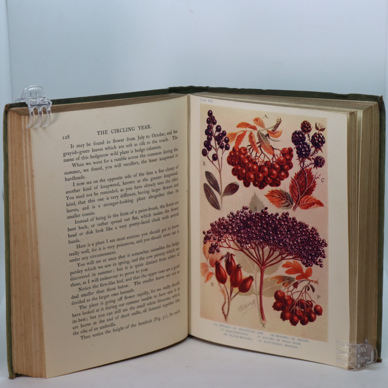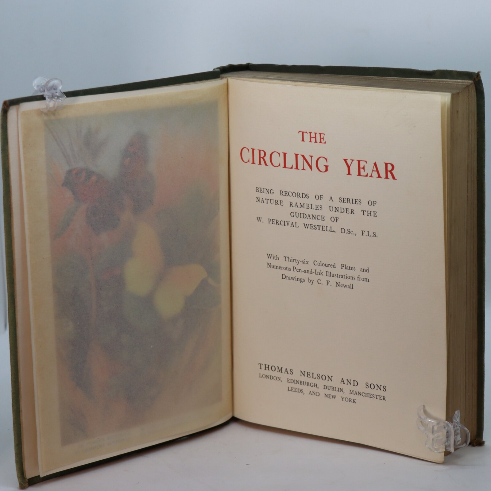 Green cloth binding with gilt title and decoration on the spine. Gilt title and two birds image on the front board.