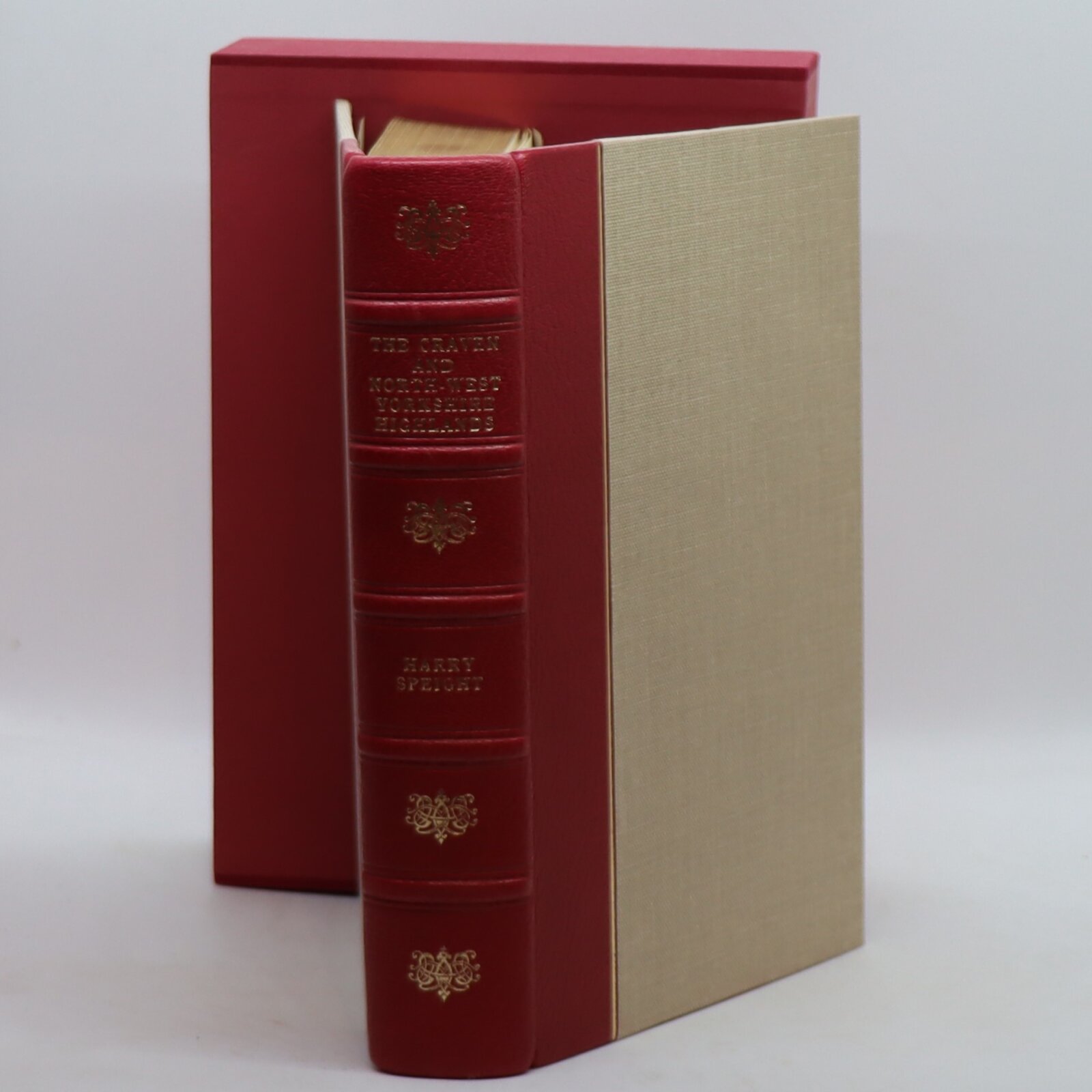 In a fitted box. Red leather spine with raised banding, gilt title and emblem decoration. Beige cloth boards.