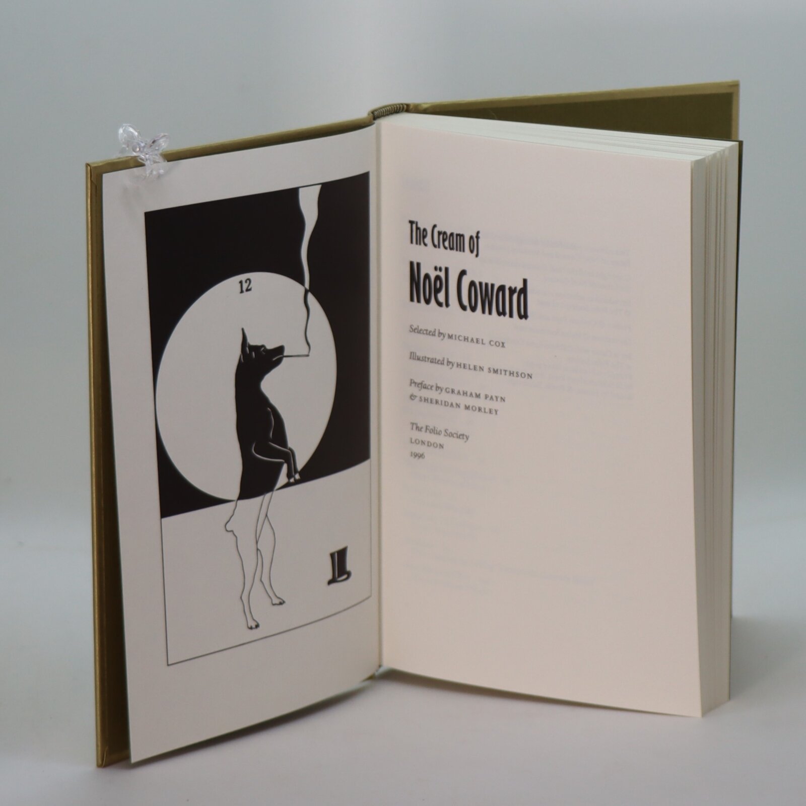 In a fitted box. Gilt cloth binding with black image of a dog in a top hat on the front board. Black title and figure on the spine.