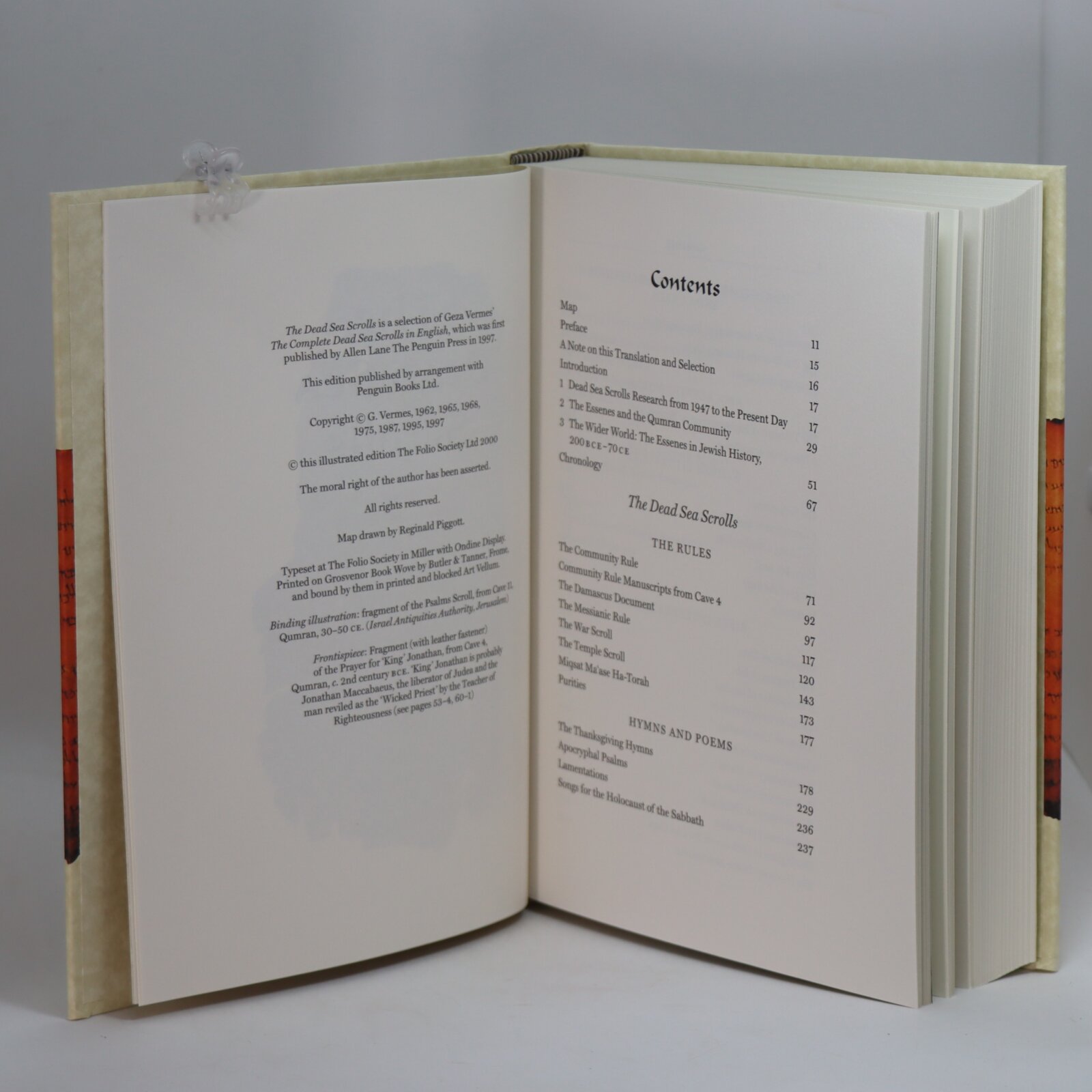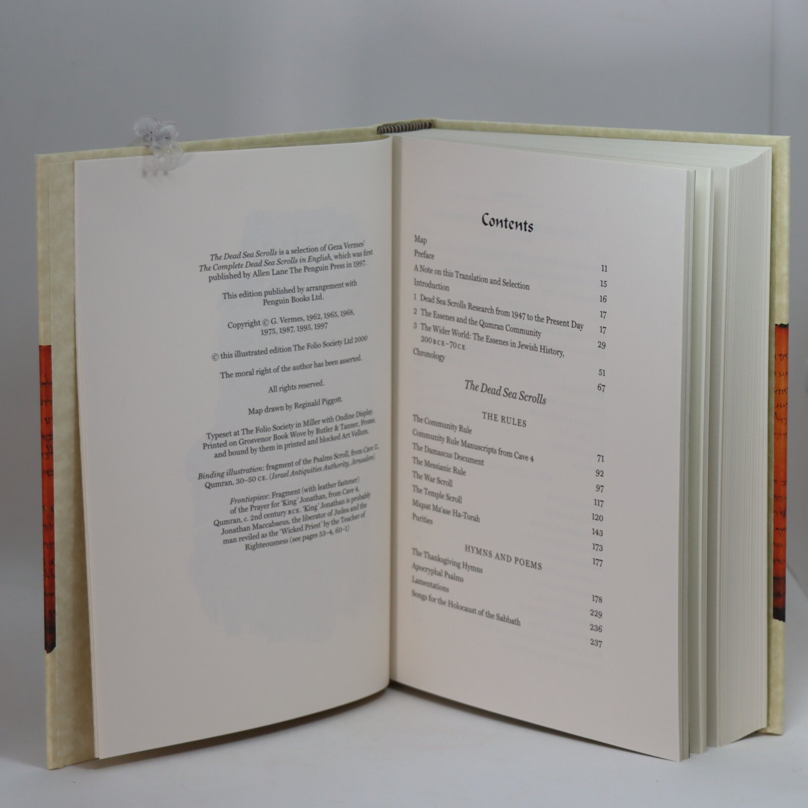 In a fitted box. Cream paper binding with orange and black image of the scolls. Black title on the spine.