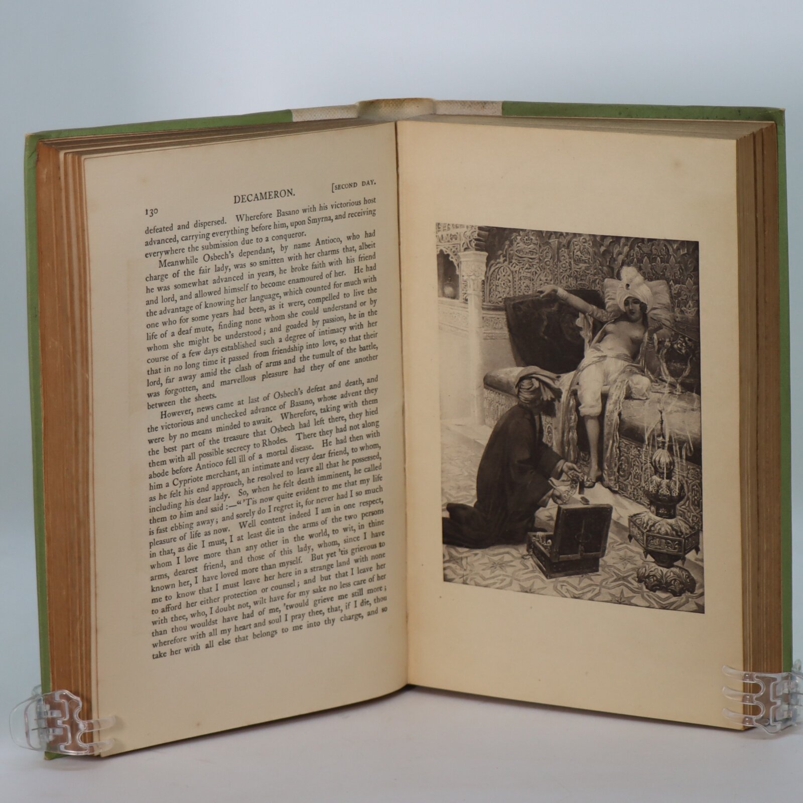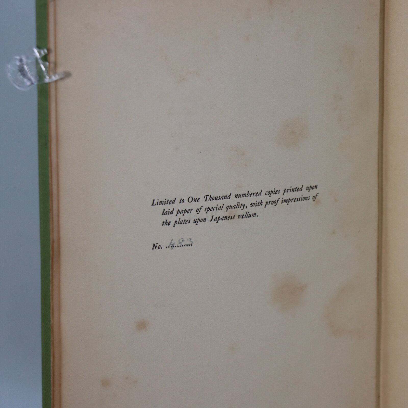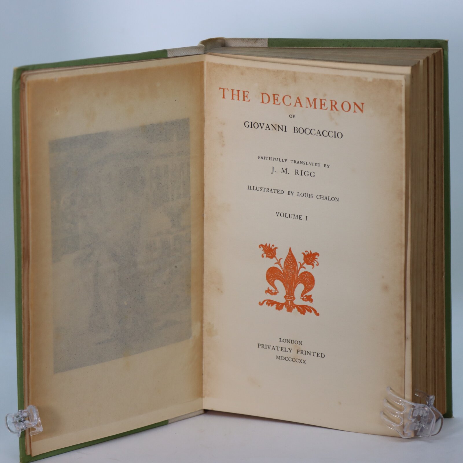 Green cloth binding with gilt title on the cream spine. Gilt fleur-de-lise on the front board.