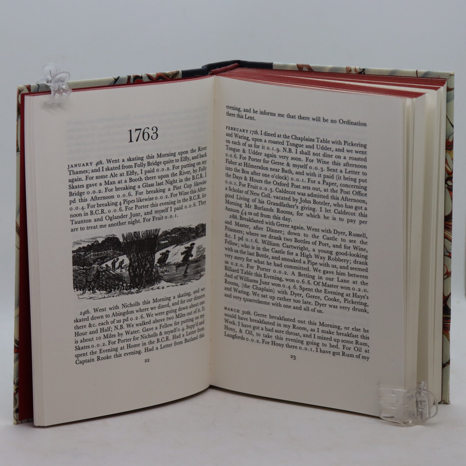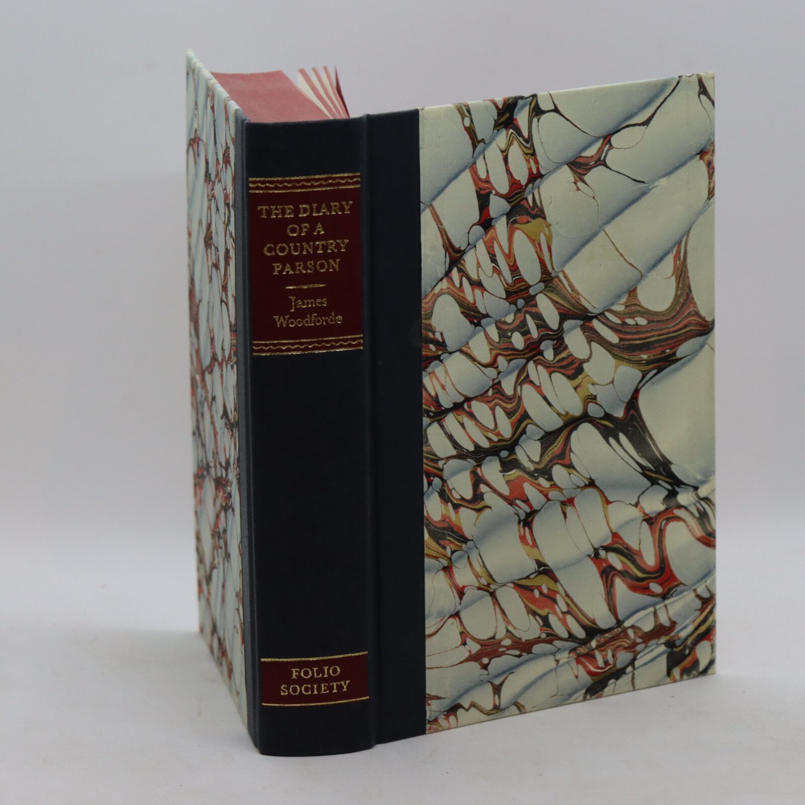 Navy cloth spine with cream and red marbled boards. Red title plates with gilt lettering and banding on the spine.