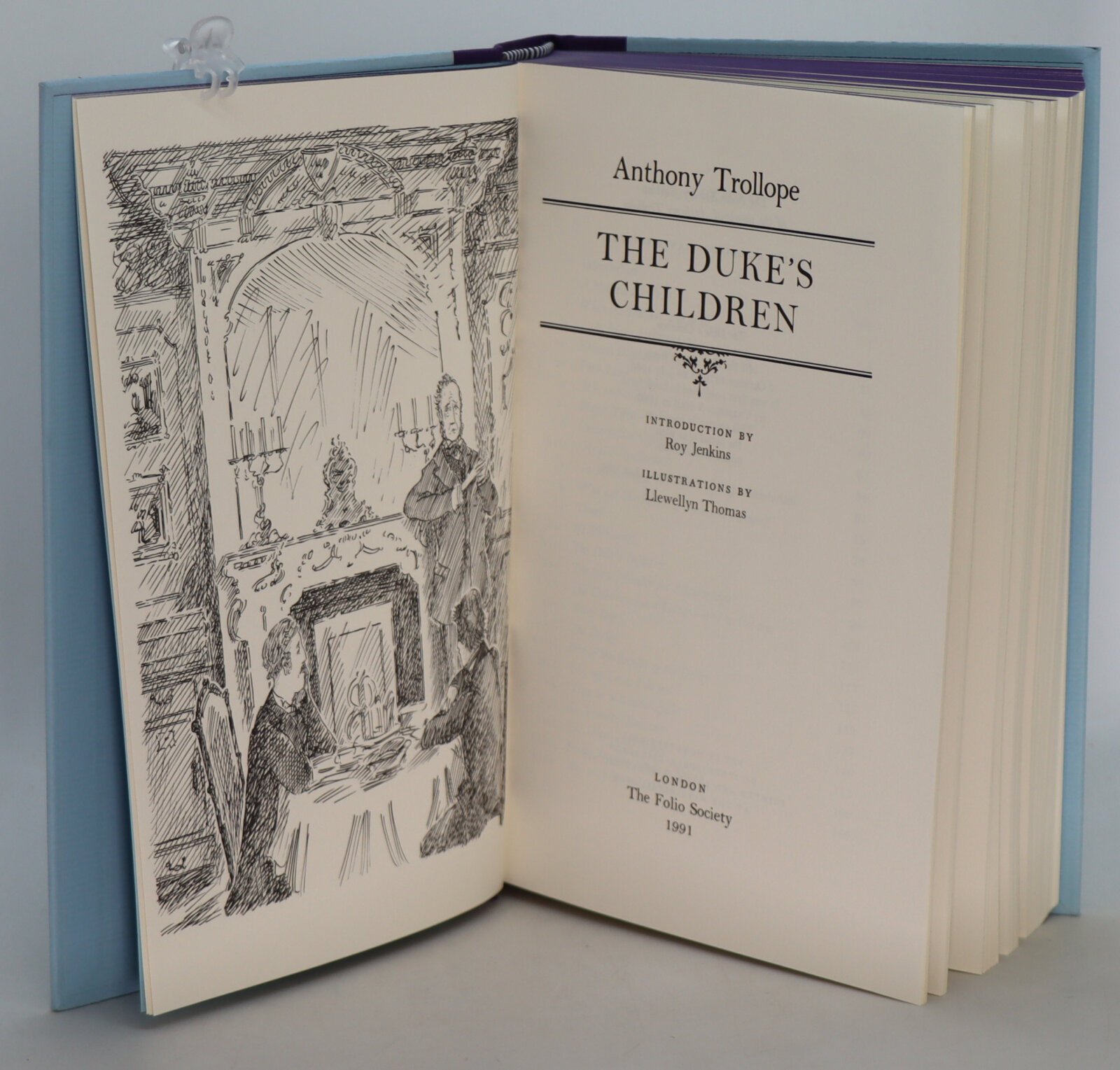 Navy cloth spine with black title plates and gilt lettering. Light blue boards with navy floral edging.