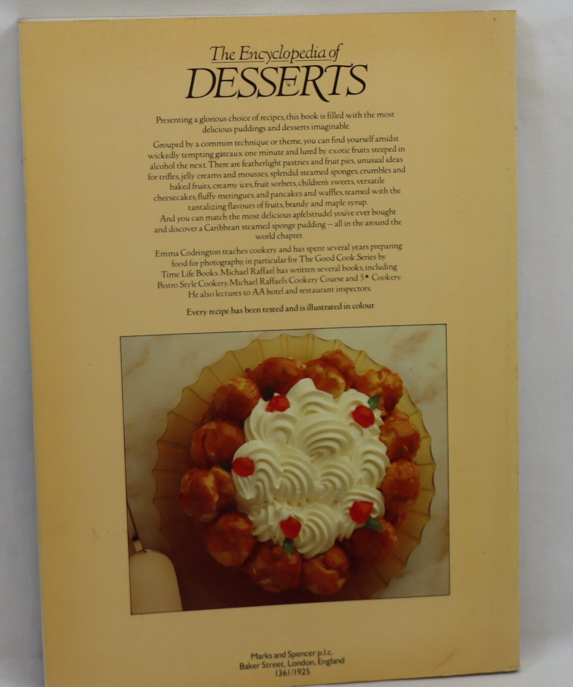 A Marks and Sparks Book: Very Good. First Edition. No dust jacket, decorated hard cover, 192 pages. This is a complete encyclopedia of fine British baking and desserts. You will find recipes for trifles, jellies and creams; meringues; mousses; fresh fruit desserts; cheesecakes; ice creams and frozen desserts; pancakes, waffles, and sweet omelettes; pies, flans and pastries; traditional steamed and baked puddings; etc. All beautifully illustrated at presentation time in colour.
