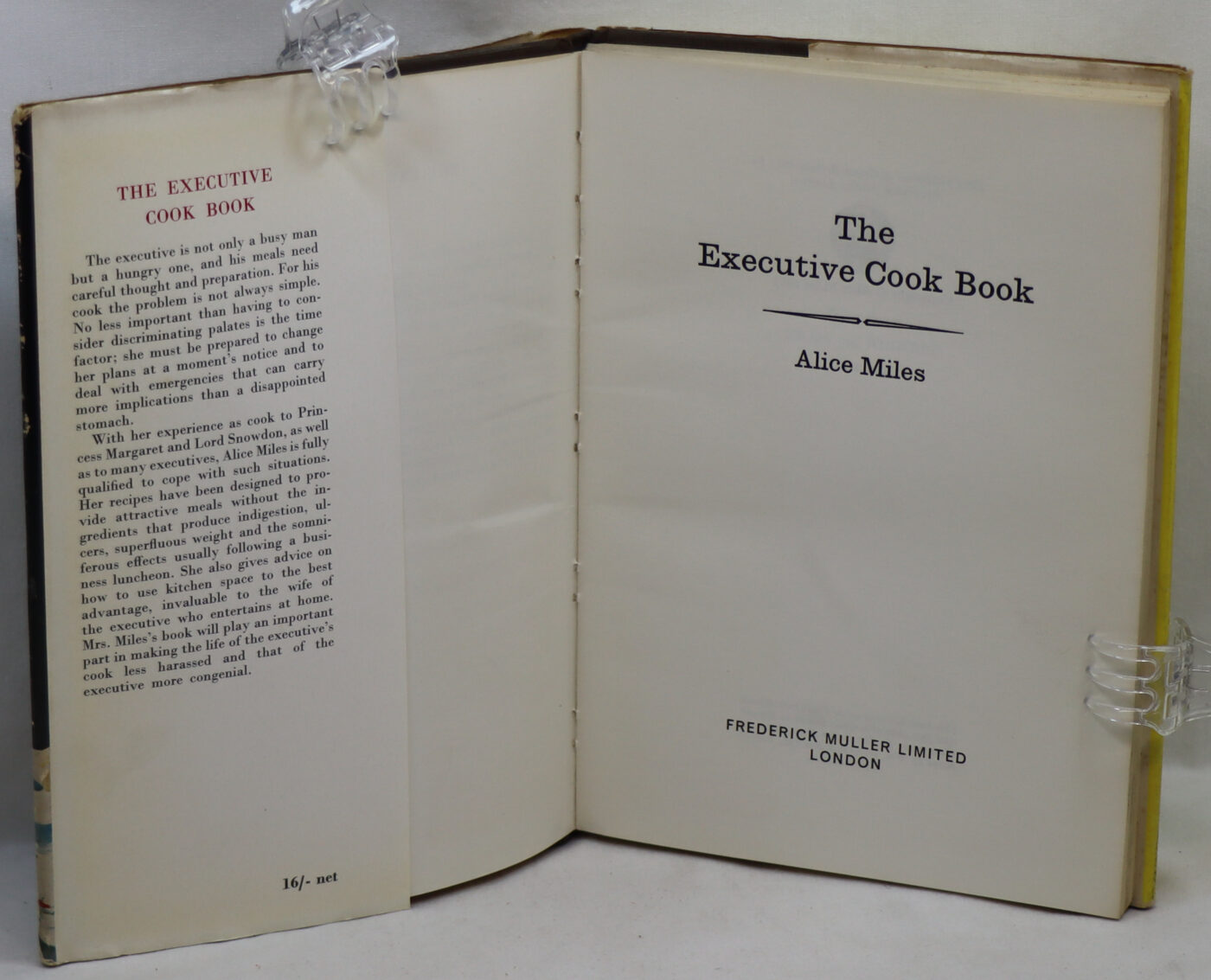 The Executive Cook Book by Alice Miles, first edition, published by Frederick Muller Ltd in London in 1965, is a vintage English cookbook, often found as a hardcover with dust jacket, featuring recipes for busy professionals, with some copies even signed by the author, noted for its clean internal pages despite age-related toning and board wear, making it a collectible for culinary history enthusiasts.