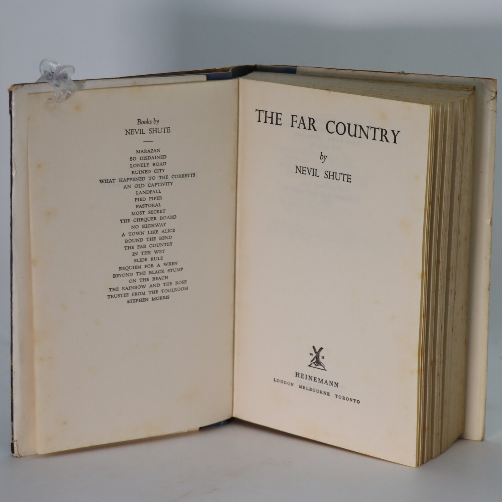 The Far Country is a novel by Nevil Shute, first published in 1952. In this novel, Shute has some harsh things to say about the new (British) National Health Service, as well as the socialist Labour government, themes he would later develop more fully in In the Wet. He describes the lot of the ‘New Australians’; refugees who are required to work for two years where they are placed, in return for free passage to Australia. The story takes place partly in London and partly in Australia. It is set in 1950.