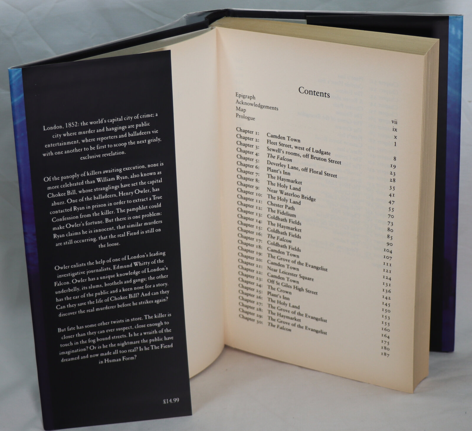 London, 1852: the world’s capital city of crime; a city where murder and hangings are public entertainment, where reporters and balladeers vie with one another to be first to the next grisly, exclusive revelation. Among the panoply of killers awaiting execution is Chokee Bill, whose stranglings have set the capital abuzz. One of the balladeers, Henry Owler, is determined to extract a true confession from the killer. However, Chokee Bill claims he is innocent and that the real Fiend is still on the loose. Owler enlists the help of one of London’s leading investigative journalists, Edmund Whitty of the Falcon, to help him to discover the real murderer before he strikes again. But fate has some other twists in store. The killer is closer than either one expects, close enough to touch in the fog bound streets. Is he a wraith of the imagination? Or is he the nightmare the public have dreamed and now made all too real? Is he The Fiend in Human Form?