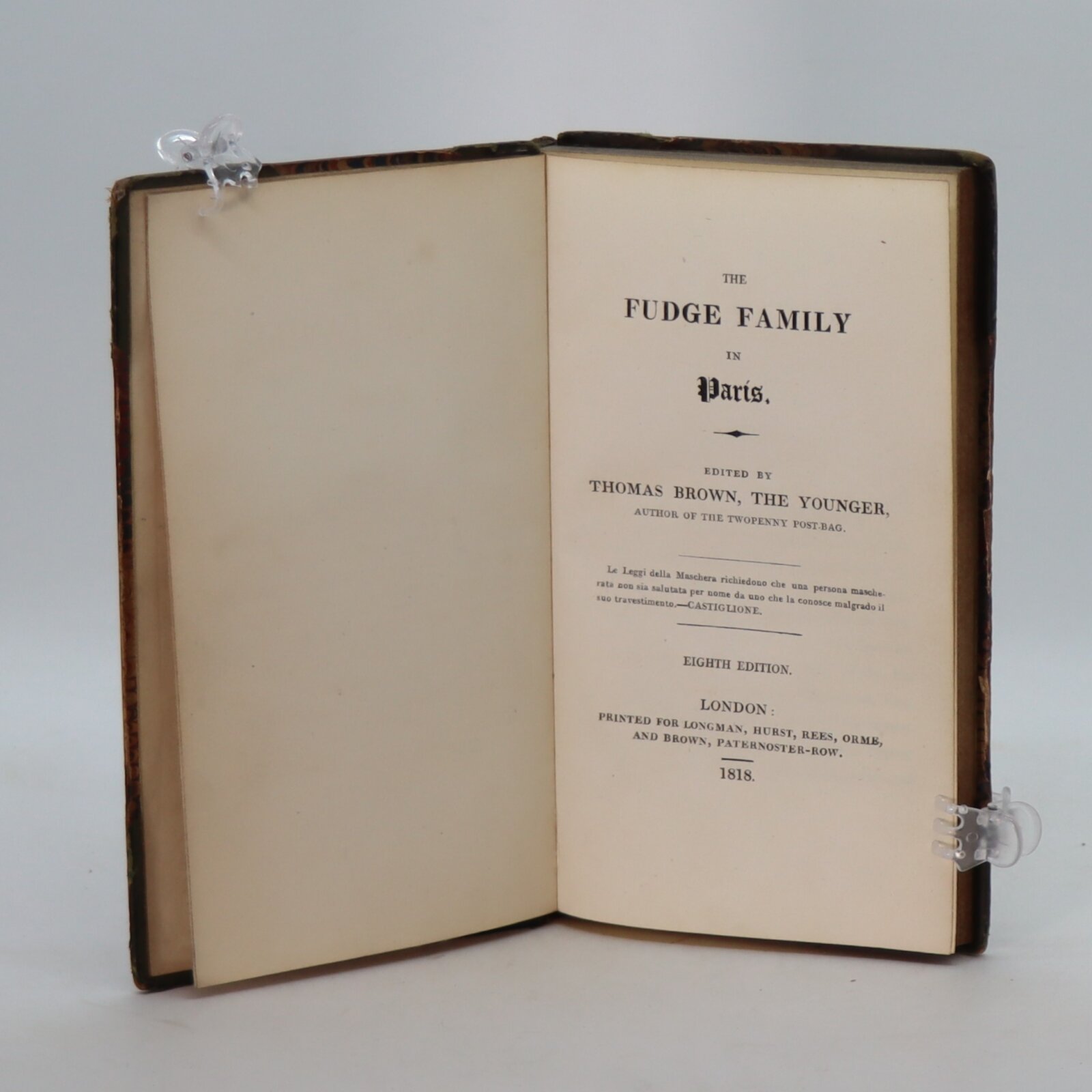 The Fudge Family in Paris was written following Thomas Moore’s visit to Paris in company with Samuel Rogers in 1817. Such was its popularity after its appearance on 10 April 1818 from the Longman partnership that five editions were published in its first fortnight, with a further four editions that year as well as American editions from New York and Philadelphia. On its title page the work’s editorship was attributed to Thomas Brown the Younger (alluding to the satirist of a century before), under which name Moore had published earlier epistolary political satires under the title of Intercepted Letters (1813). However, the true authorship of the Fudge correspondence was soon identified.