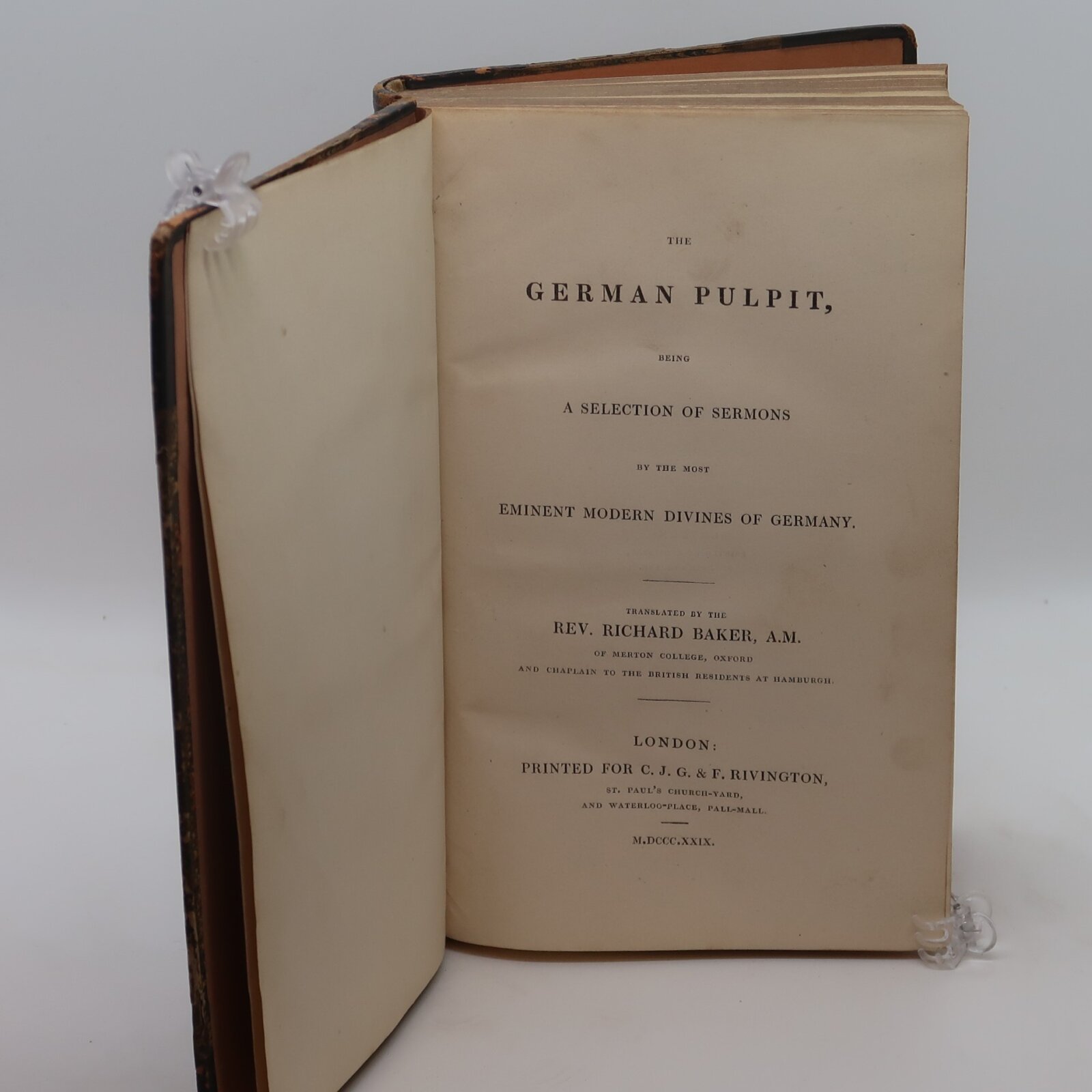 Black leather spine with brown title plate and gilt squared decoration and lettering on the spine. Tan marbled boards.