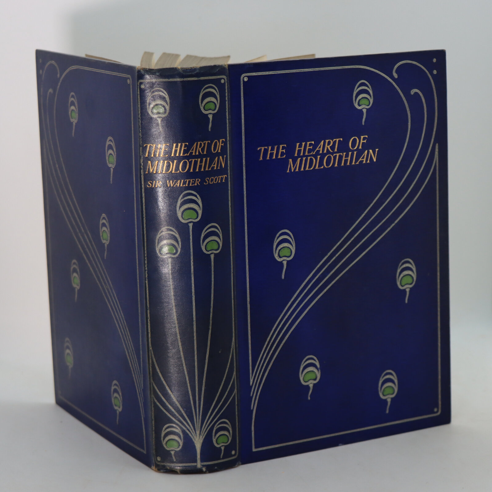 Navy cloth binding with gilt title and on the spine. Grey and green art deco style decoration on the spine and both boards.