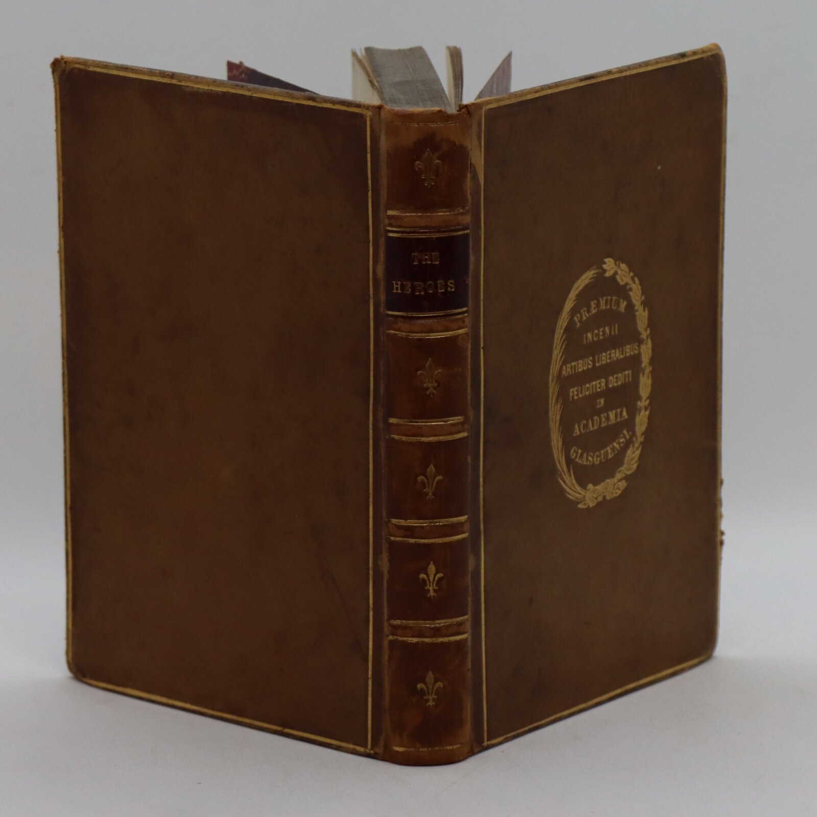 Tan leather binding, red title plate. Gilt edging and banding with embossed Glasgow Academy emblem on front board. Illustrations in colour.