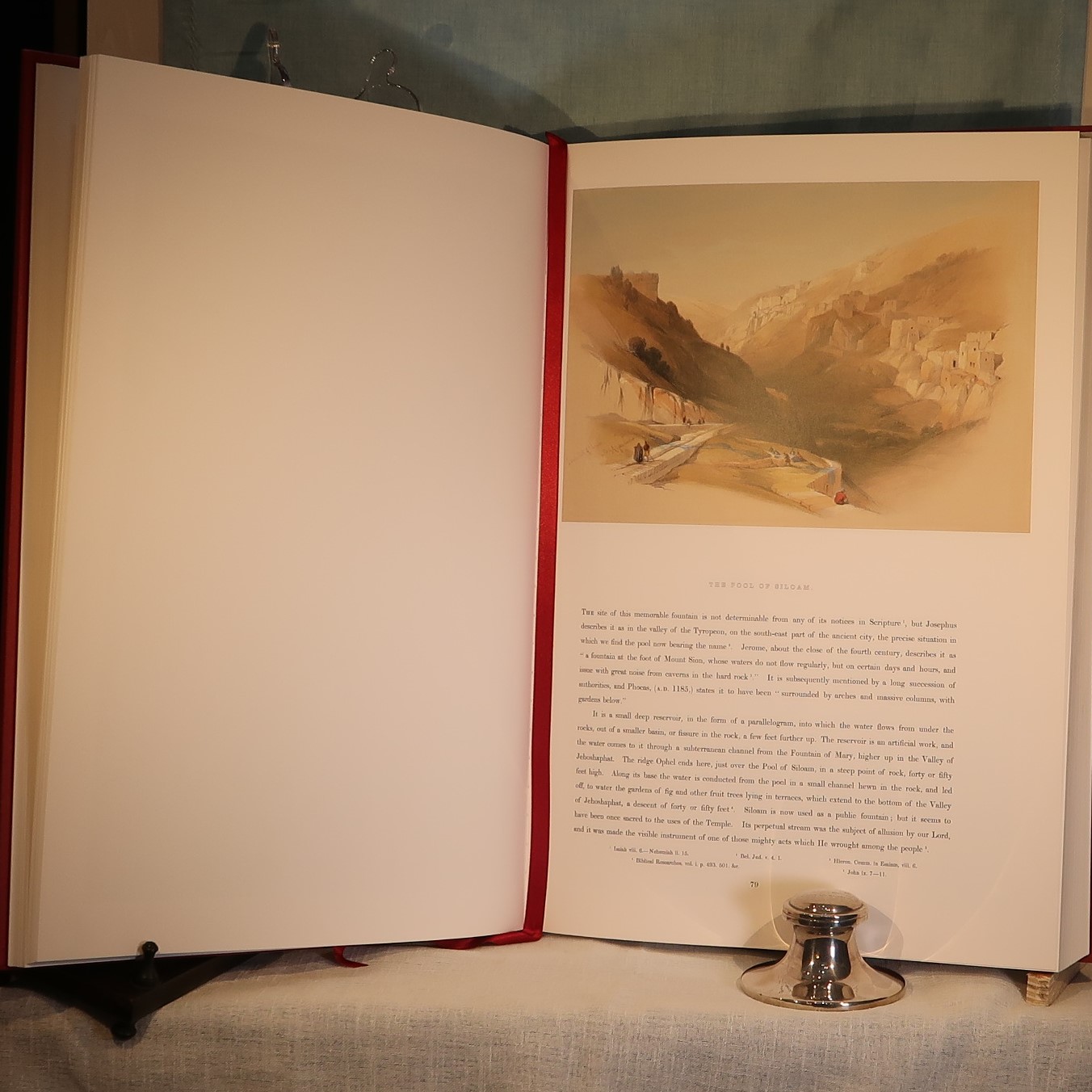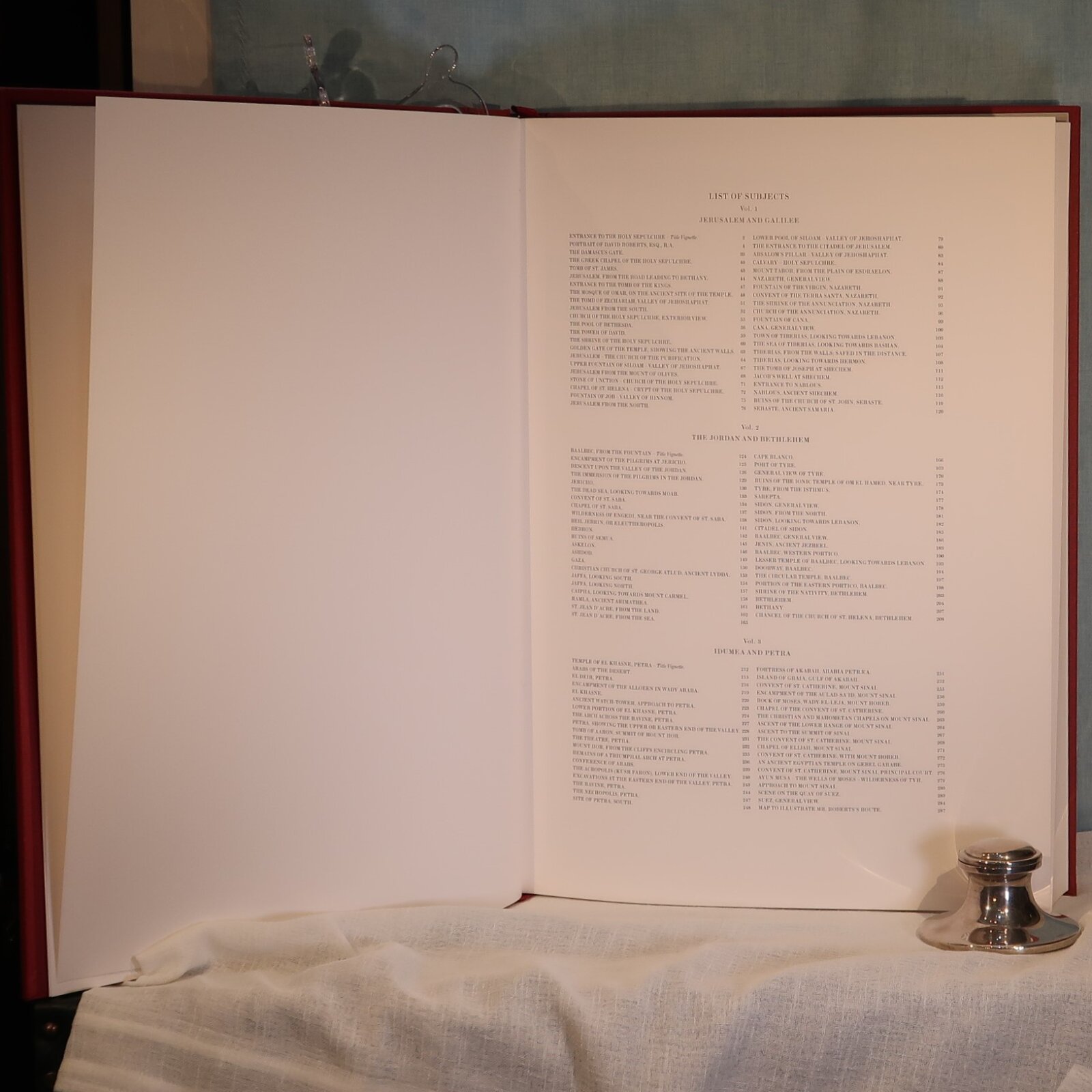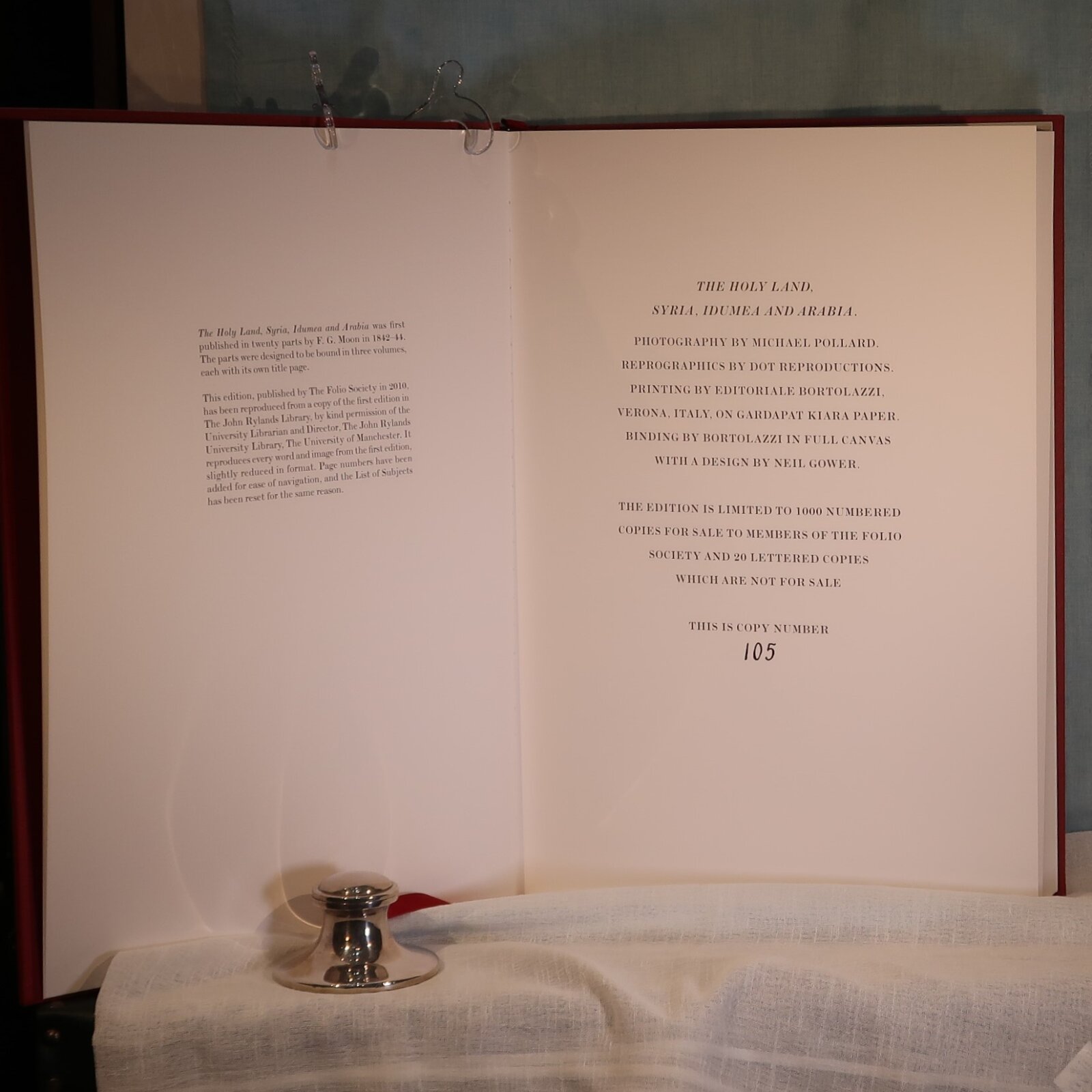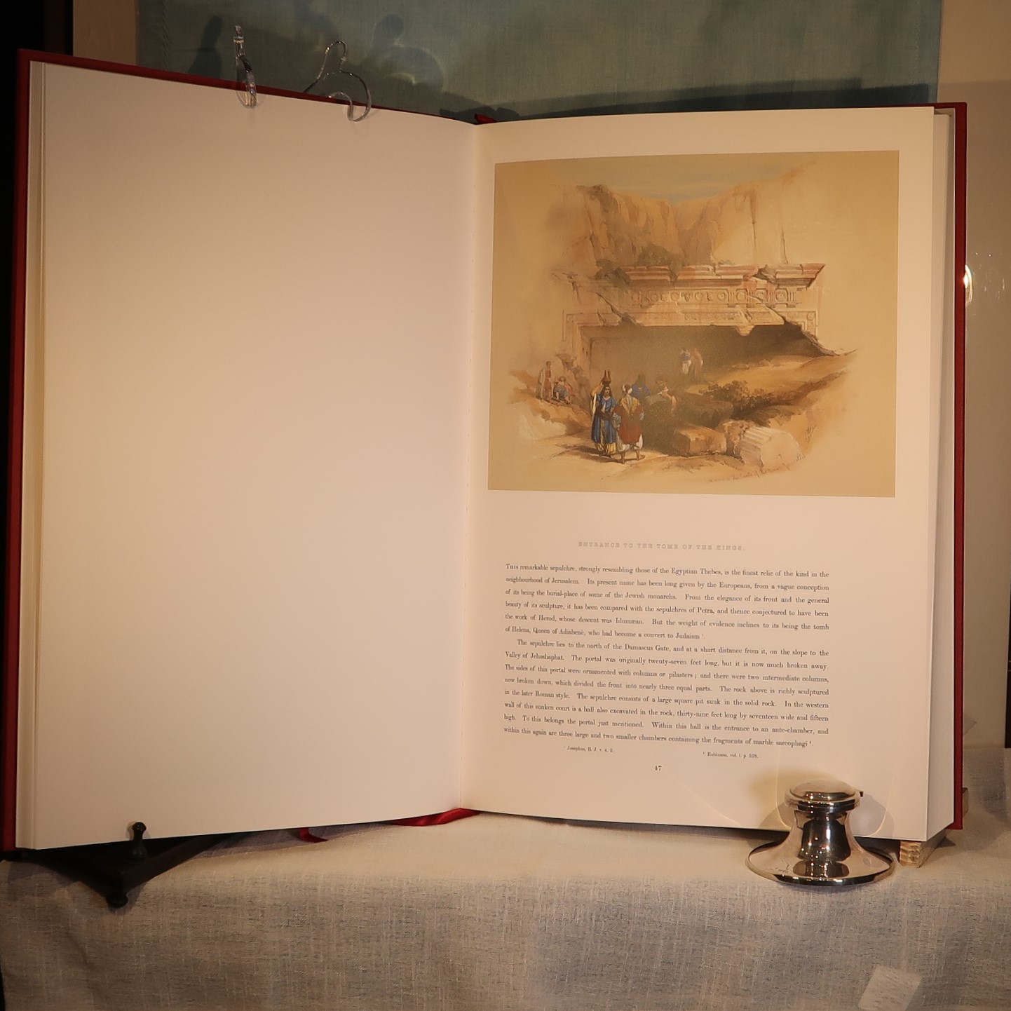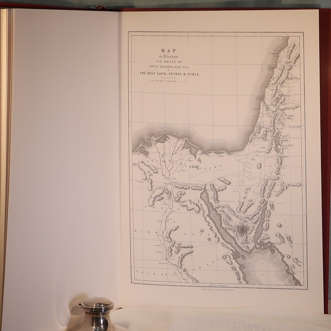 Facsimiles of the work of artist David Roberts. In a red cloth fitted box. Red Cloth bound with black and gold drawing on the front cover. Top edge of pages gilt. Number of 105 of 1000 for members of the Folio Society.
