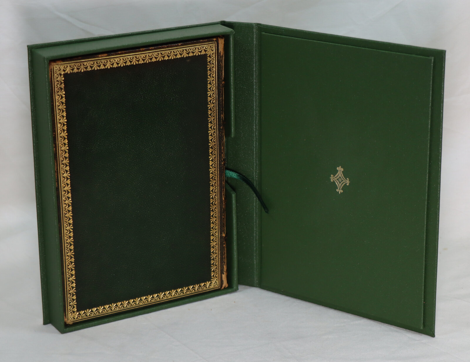 Green grained leather binding by Lauriat CC Boston. Gilt design on outside edges, title and spine. Presentation copy.