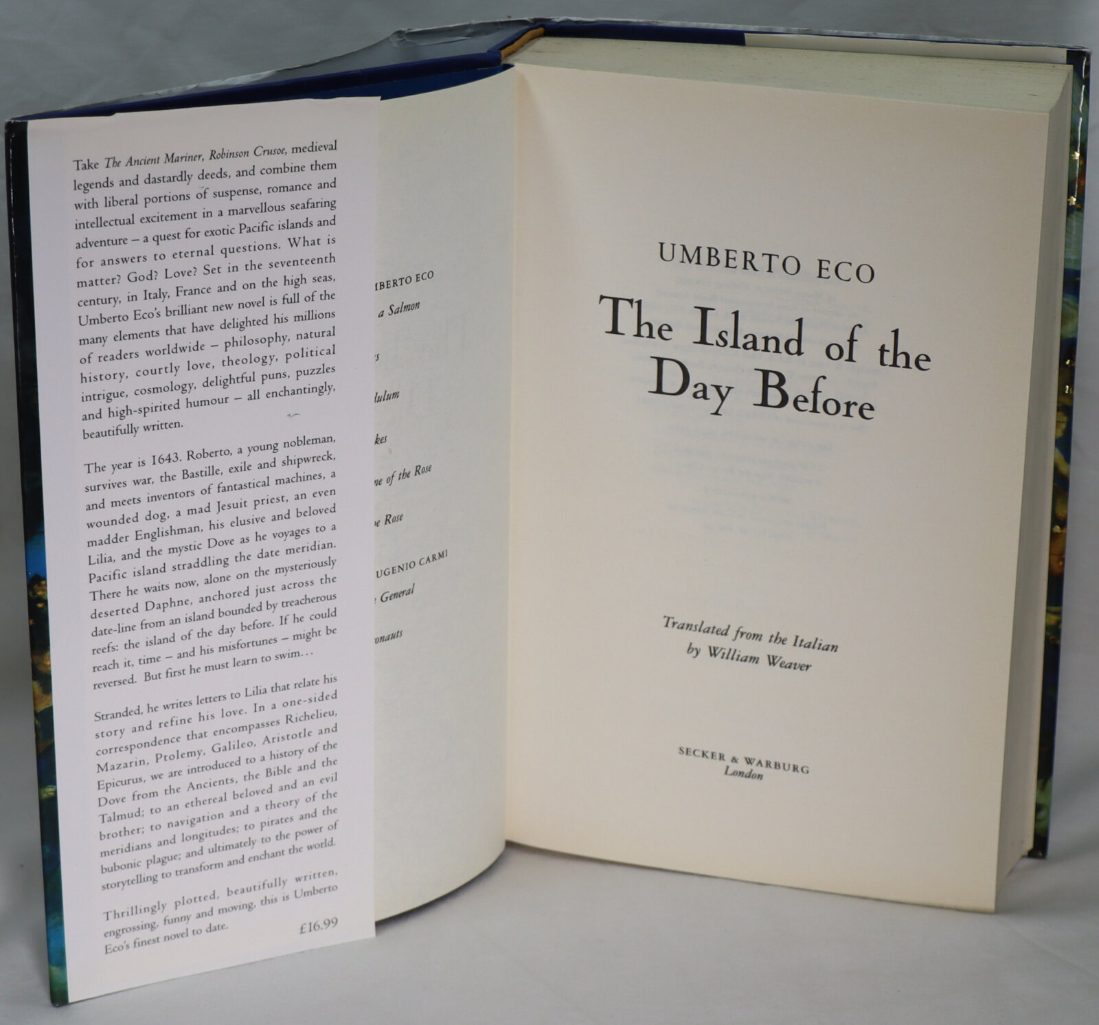 The year is 1643. Roberto, a young nobleman, survives war, the Bastille, exile and shipwreck as he voyages to a Pacific island straddling the date meridian. There he waits now, alone on the mysteriously deserted Daphne, separated by treacherous reefs from the island beyond: the island of the day before. If he could reach it, time – and his misfortunes – might be reversed. But first he must learn to swim…
