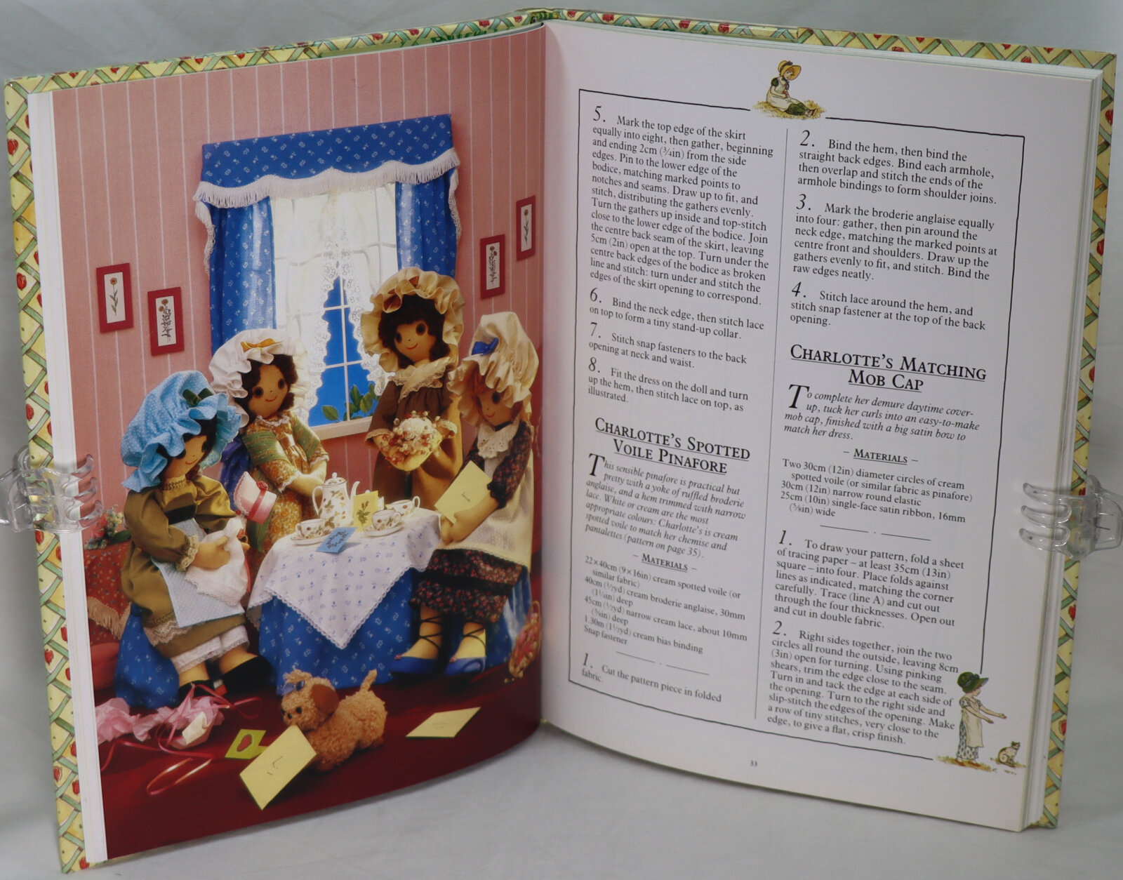 Bought this back in 1988 and have made a few felt rag dolls from the instructions.The pictures really inspire you, showing dolls in various scenes (party, winter visiting, bedtime) dressed in clothing of Jane Austen era. Not really difficult to get lovely results, and you can adapt patterns as desired. Also includes details on how to make the dolls’ pet dog and bedroom & living room furniture, and even a doll for them! Really lovely book
