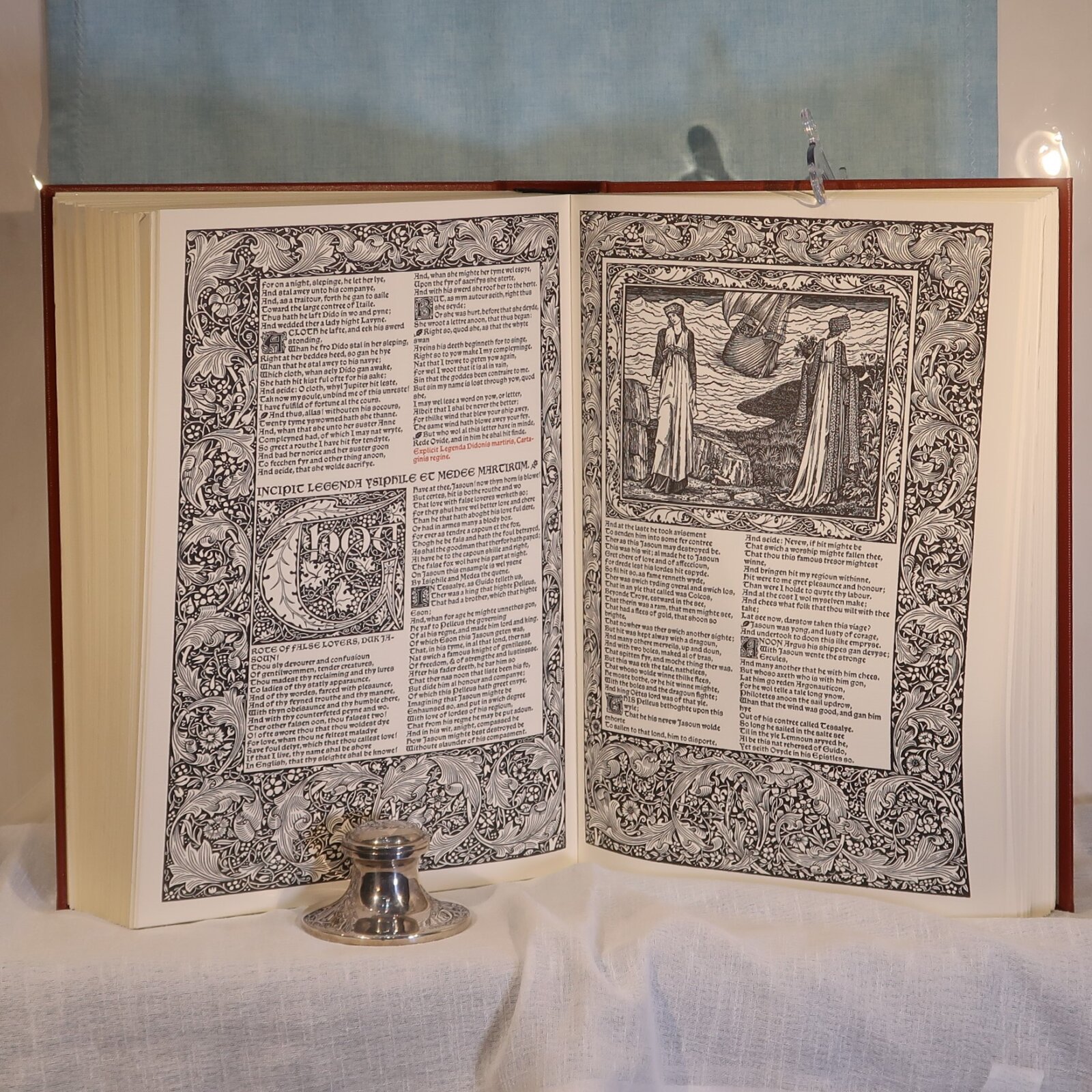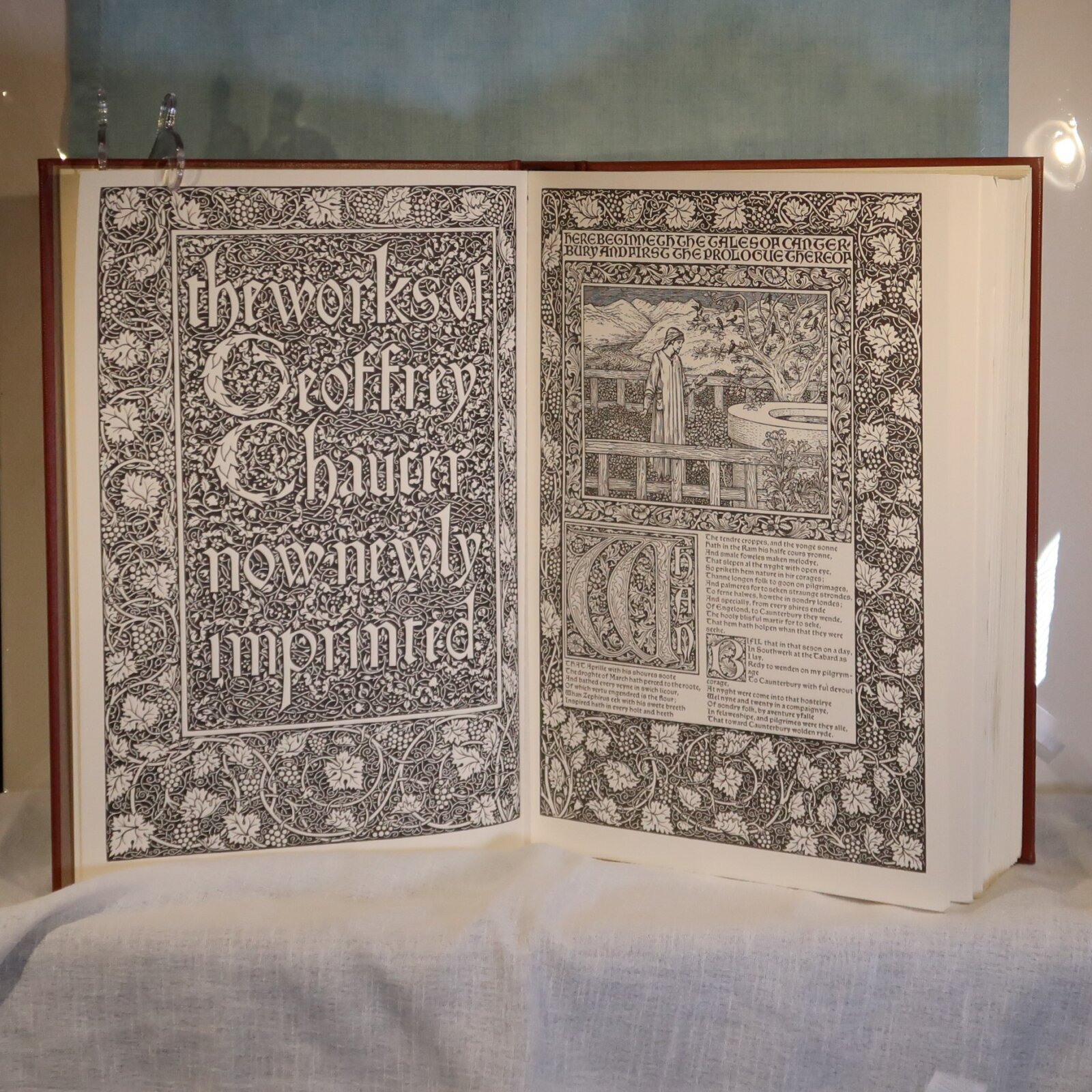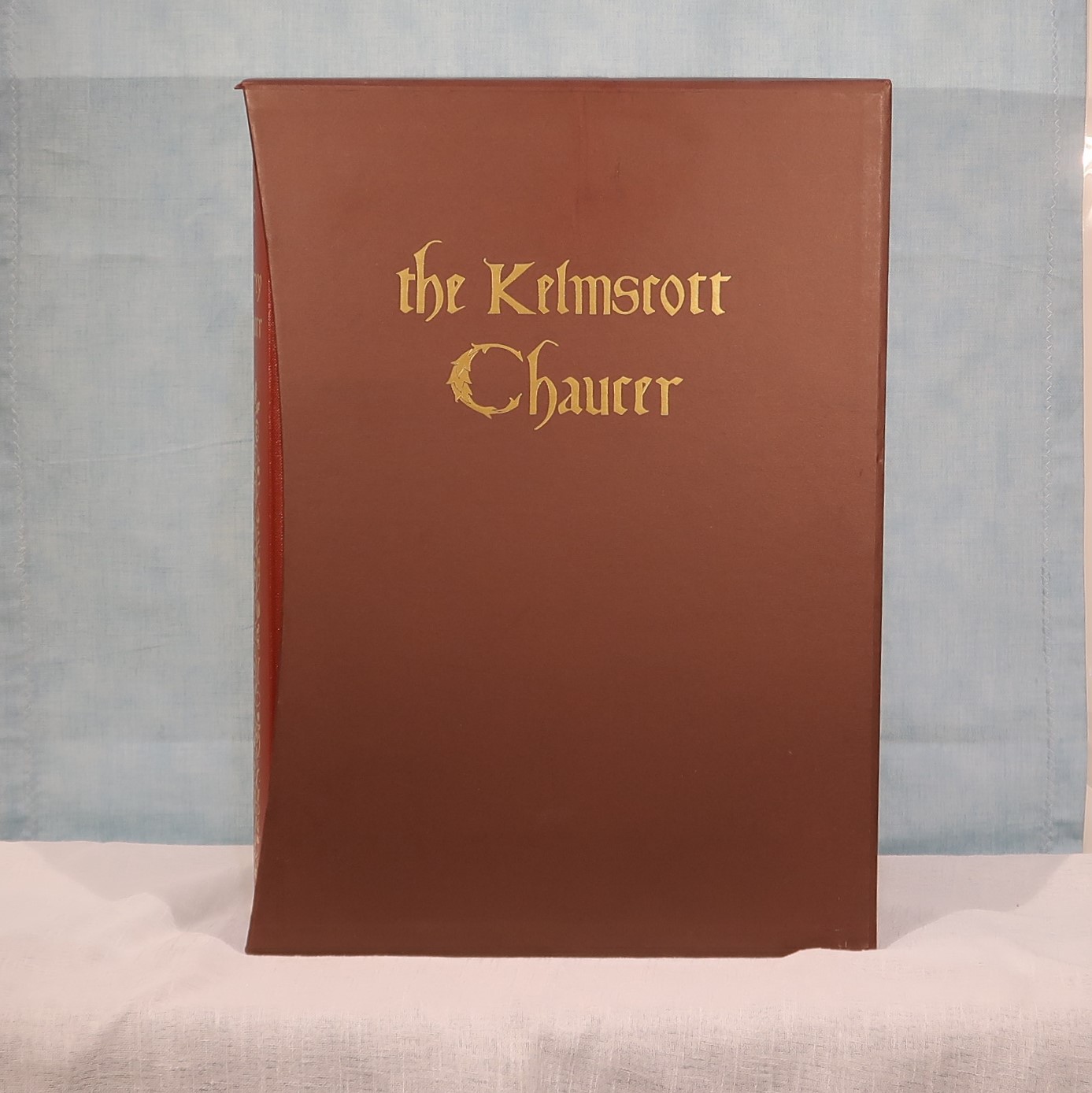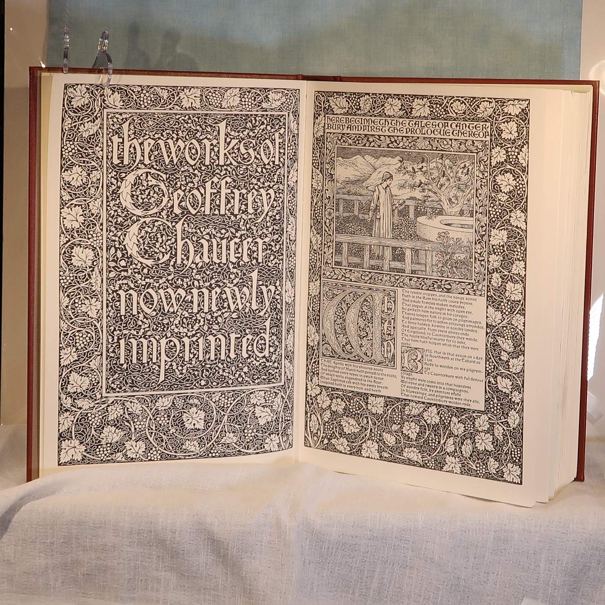 Facsimile of the works of Geoffrey Chaucer ( William Morris at Kelmscott Press with Edward Burne-Jones illustrations). In a red fitted box. Bound with red cloth with gold lettering and design.