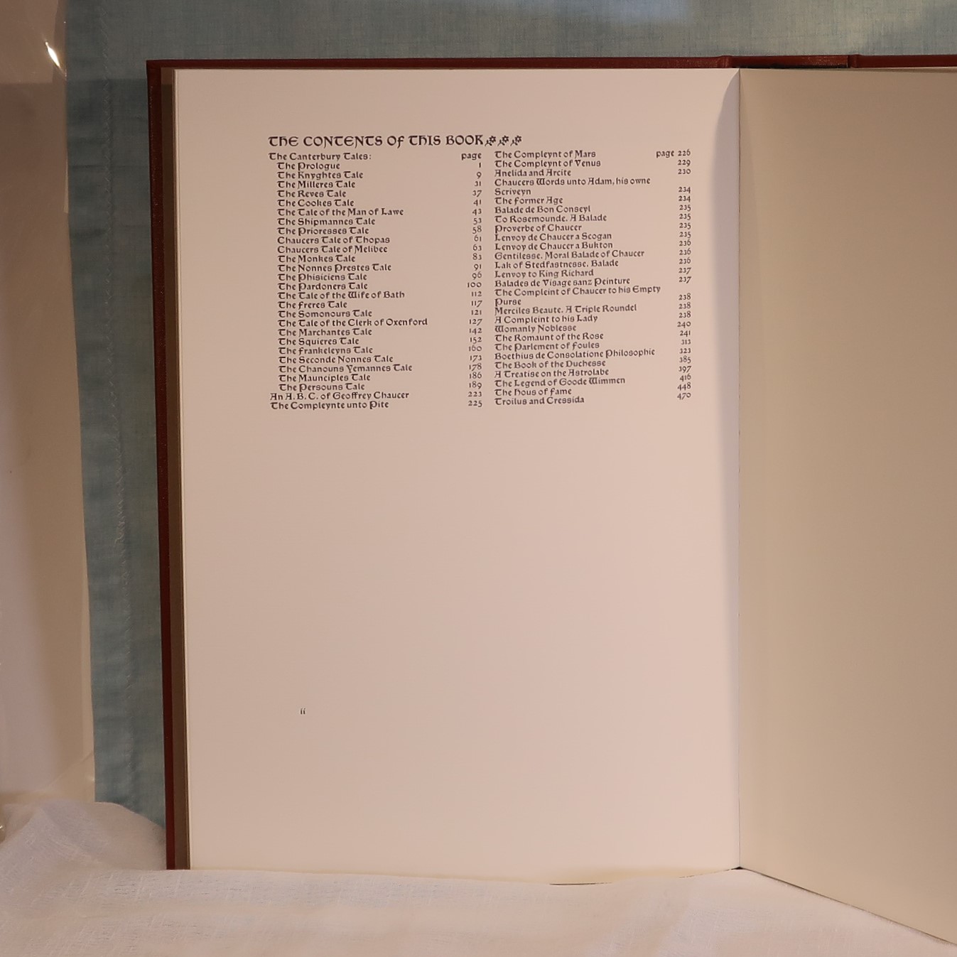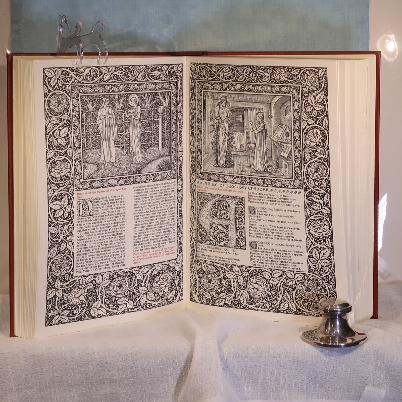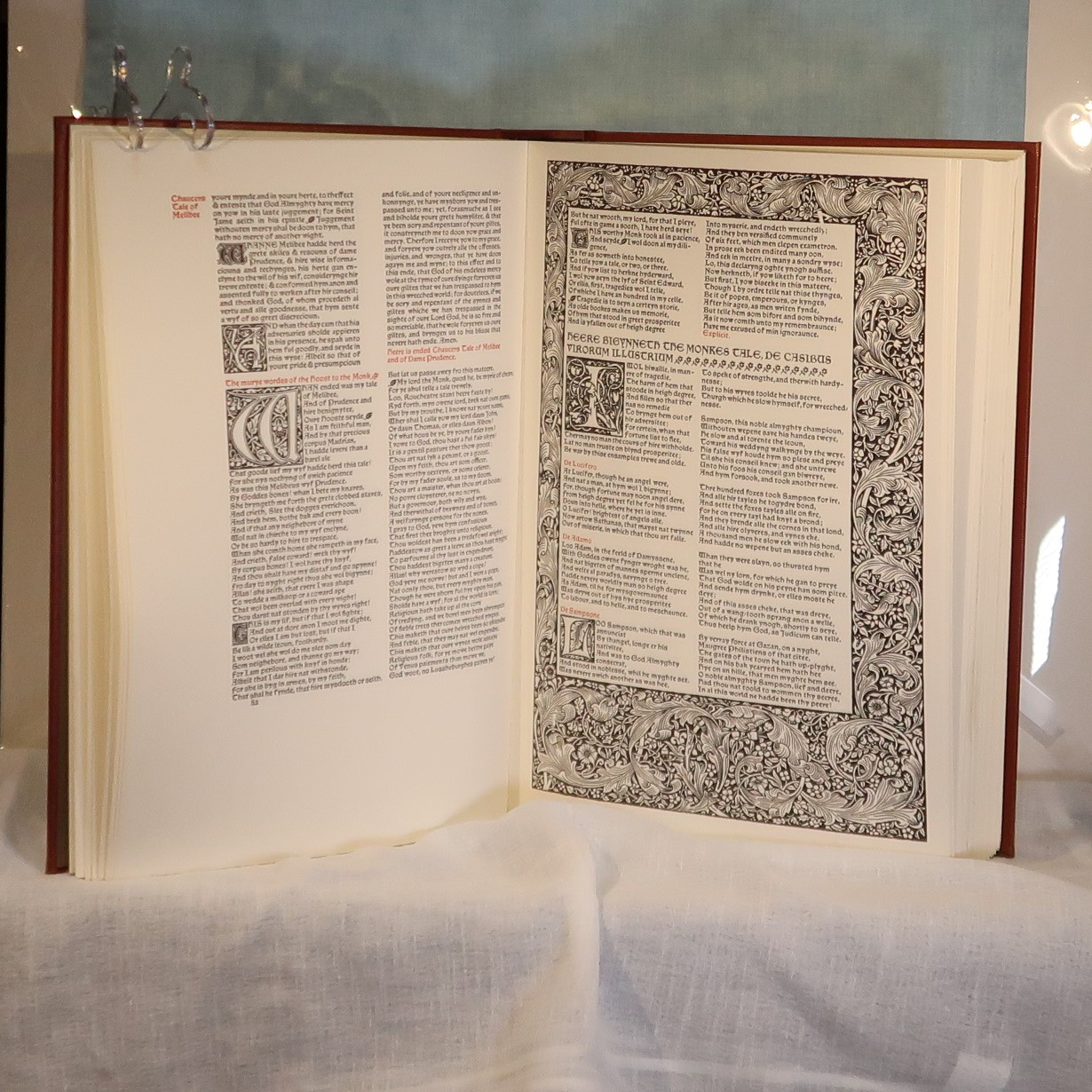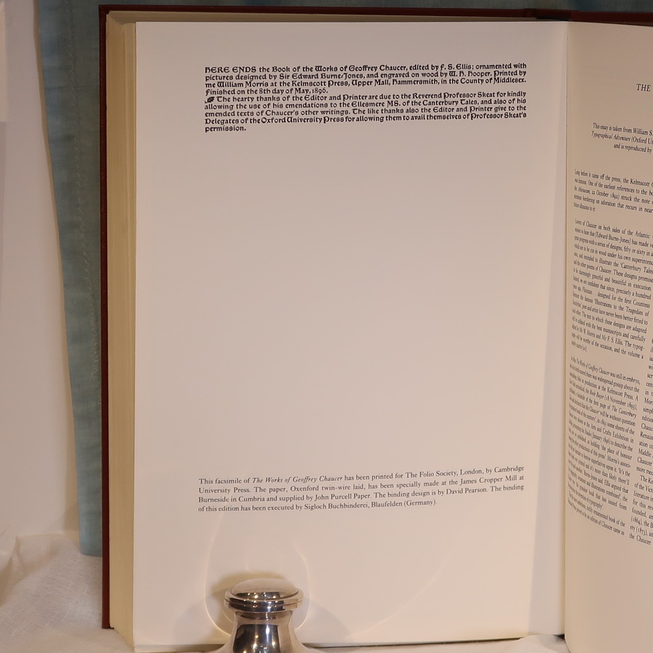 Facsimile of the works of Geoffrey Chaucer ( William Morris at Kelmscott Press with Edward Burne-Jones illustrations). In a red fitted box. Bound with red cloth with gold lettering and design.