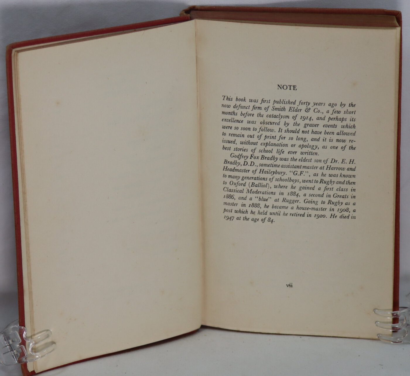 Godfrey Fox Bradby (1863–1947) was a schoolmaster at Rugby School, who also had a wide-ranging literary career. He wrote poems, novels, literary criticism and hymns. Born 1863, the son of Revd. Edward Henry Bradby (1826–1893) and his wife, Ellen Johnson (1836–1918). He grew up at Haileybury College, where his father was headmaster. He attended Rugby School and Balliol College, Oxford. At Oxford he gained a First in Classical Moderations in 1884 and a Second in Literis Humanioribus (as the degree title then was) in 1886. From 1887 until his retirement in 1920, he taught at Rugby. (See also this book’s forward!)