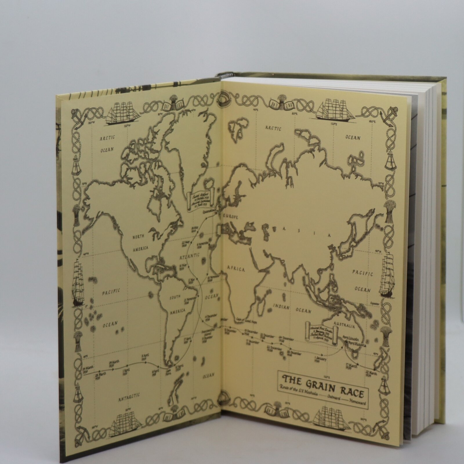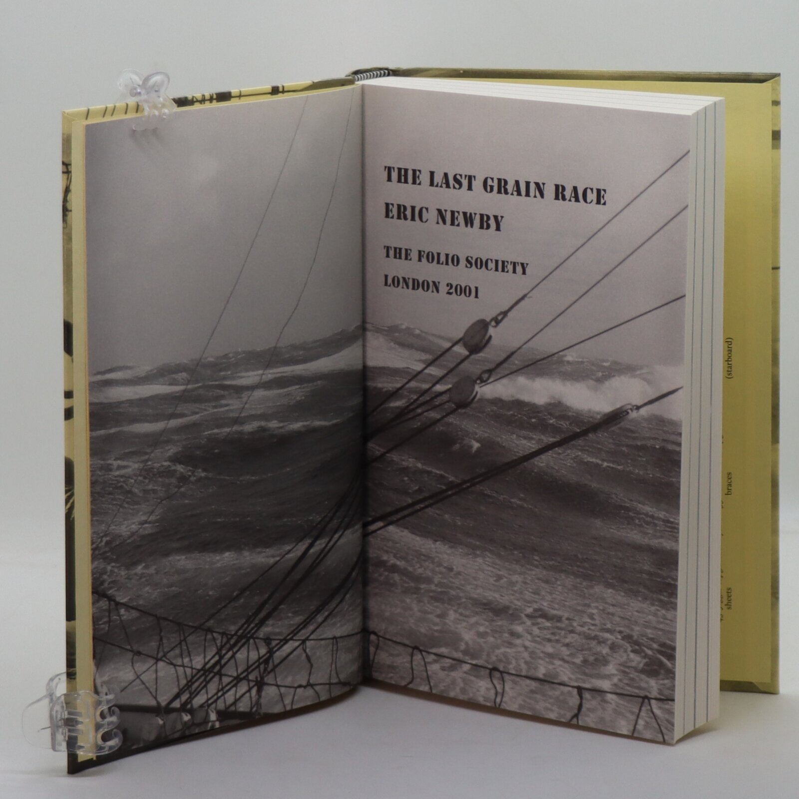 In a fitted box. Cream paper binding with monocrome storm image on a ship. Gilt title on the spine.