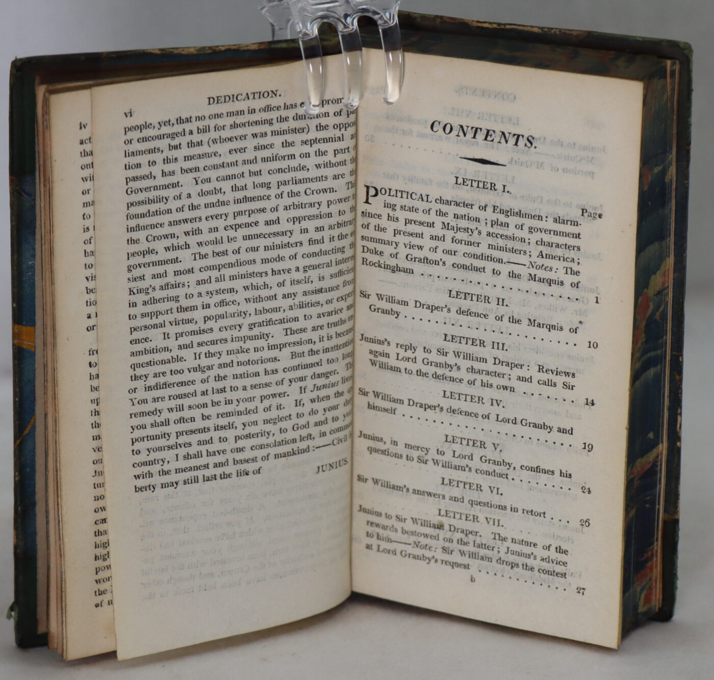 A nice clean copy, and as the photographs here illustrate remains in a well kept condition. This is an early 19th century miniature edition. A good original binding. Hinges and corners are carefully strengthened. Smooth spine with gilt decoration and original red leather title label. Marbled endpapers. Free-endpapers lightly soiled. Engraved frontis by “J. Chapman sc.” after a design by “R. Cooke el.”. Printed title and clean text throughout, on lightly toned paper. colophon to base of title and at the base. * The “Junius Letters” appeared anonymously between 1768 and 1773. They were published in various newspapers before being gathered together. They were political letters, opposing the policies of the king and the government. Their authorship has never been definitely proven, but Sir Philip Francis is a strong candidate. This edition contains all the letters of Junius, Philo Junius, and of Sir William Draper and Mr. Horne to Junius, with their respective dates, and according to the order in which they appeared.