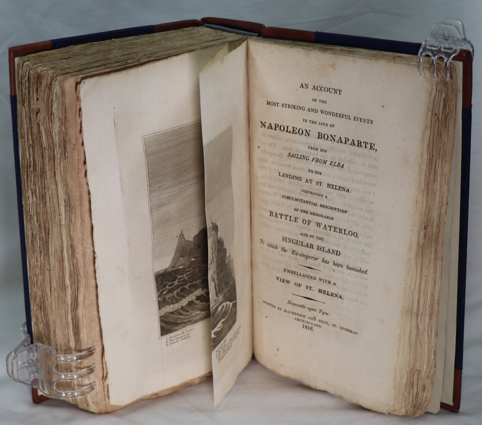 These two books are rebound into one. Hardcover. No marks or writing, clean tight; brown leather spine as per our excellent photographs. One subtitle: Containing a succinct and interesting account of his early character and of his rapid elevation to imperial dignity; second subtitle an account of the most striking and wonderful events in the life of Napoleon Bonaparte from his sailing from Elba to his landing at St. Helena, with fold out etching of the Island of St. Helena dated 1816.