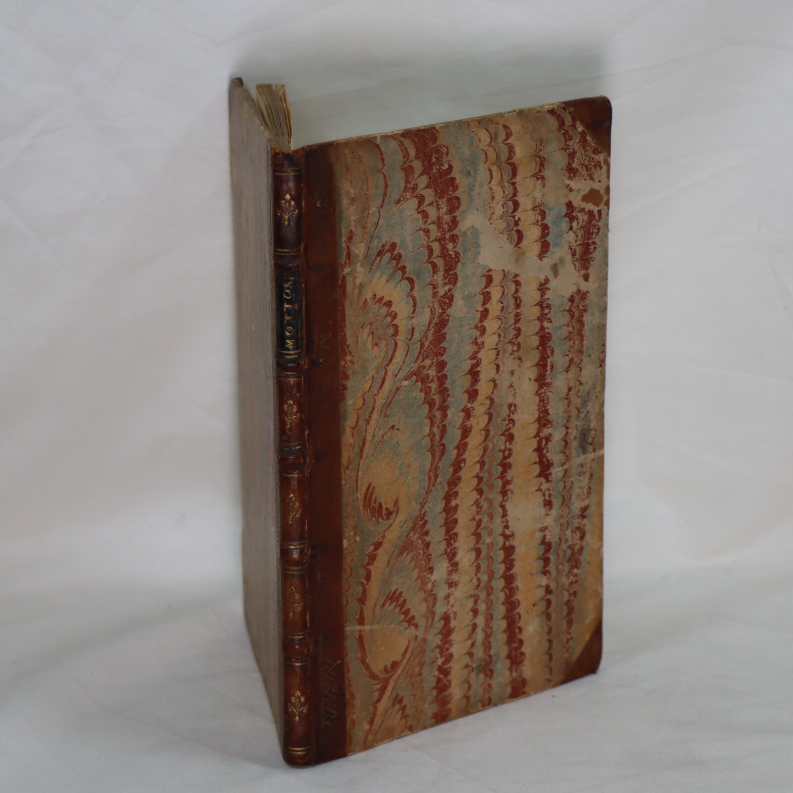 Brown calf spine with black title plate and gilt title. Red and tan marbled boards.