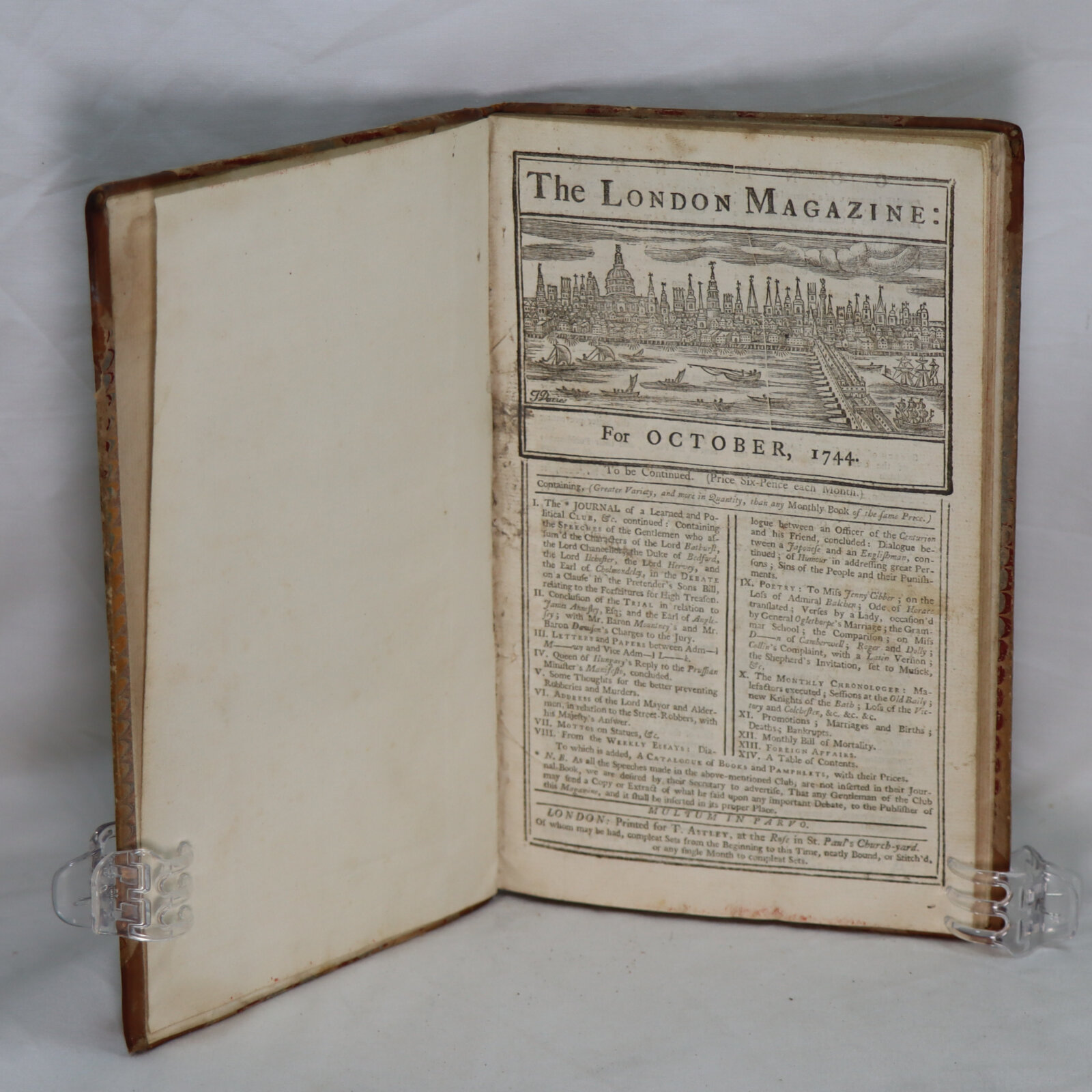 A nicely bound single copy of this very full magazine giving a good societal view of London on the eve of the great Jacobean Revolution of 1745.