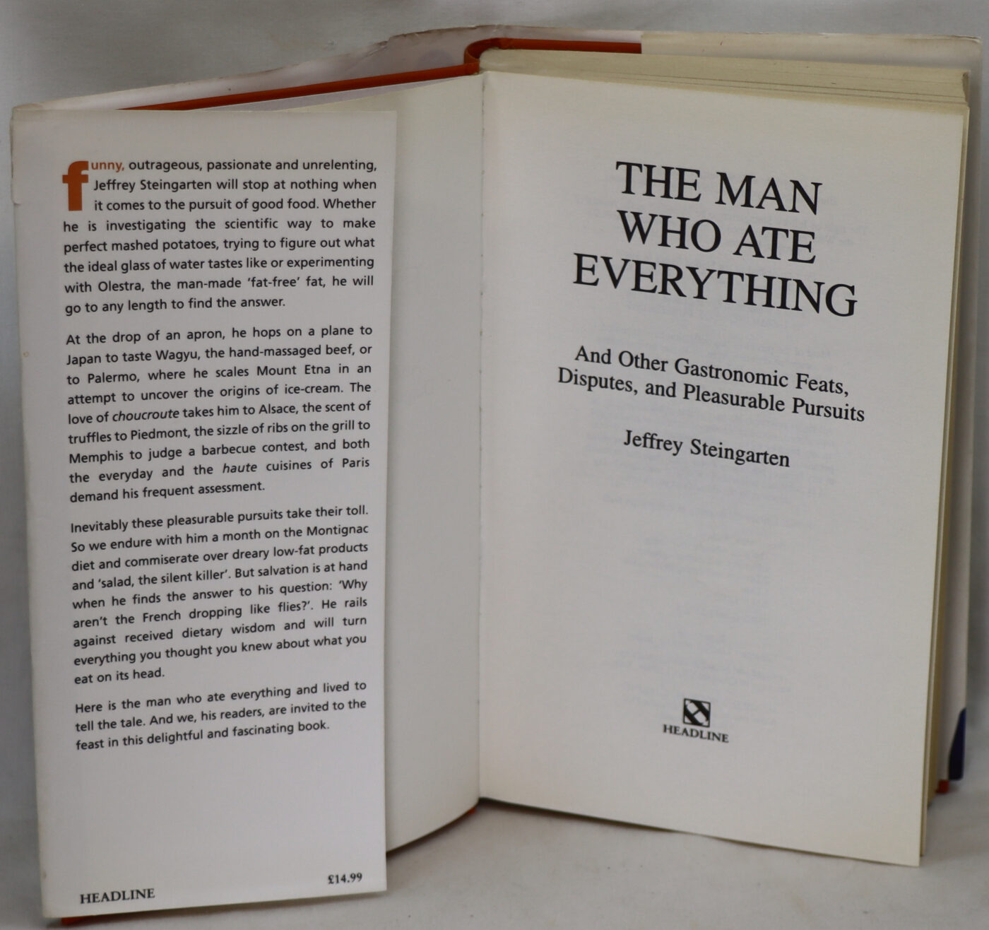 Review: Jeffrey Steingarten was a lawyer until 1989, when an invitation to write for American Vogue effected his metamorphosis into a food writer–unquestionably a higher form of life. As the self-styled Man Who Ate Everything, he could allow himself no favourite foods nor irrational dislikes; consequently, the first piece in the book describes his heroic efforts to purge himself of all food phobias in preparation for his new post. The Six-Step Programme he devised was largely successful: as a result, kimchi (Korean pickled cabbage), anchovies, Greek food and clams (“I feel a mild horror about what goes on in the moist darkness between the shells of all bivalves…is the horror deeper than I know?) all assumed a place in his diet. He became the “perfect omnivore”. Now he seems to travel the world, eating. The Man Who Ate Everything deals to a certain extent with food and cooking, but its real subject (aside from Steingarten himself) is our attitude towards what we eat–what our food choices reveal about us. So he discusses the complex issues surrounding choosing the best brand of bottled water; the pros and cons of cooking “French” fries in horse fat; the deadly toxins that infest a virginal salad. He travels to Alsace in pursuit of le Veritable Choucroute Garni, to Piedmont to join white-truffle hunters, to Kyoto to worship at the shrine of kaiseki ryori, formal Japanese haute cuisine. By turns witty, learned, satirical and riotously farcical, The Man Who Ate Everything is never less than passionate about his subject. —Robin Davidson