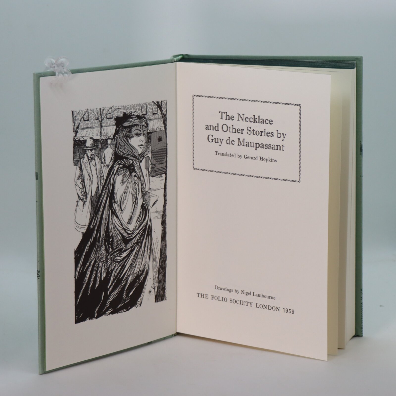 Light green cloth binding with image of people on both boards. Gilt title on the spine.