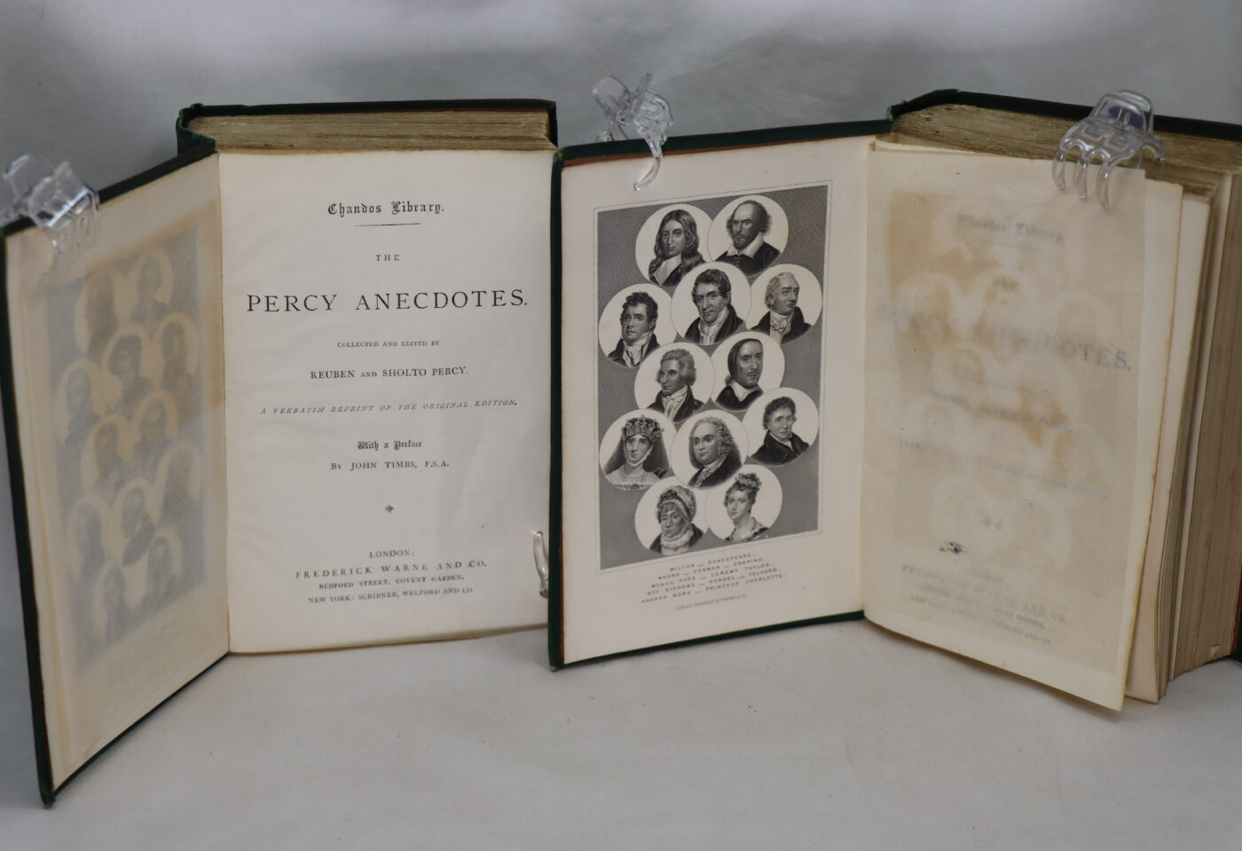 For conditions, please view our photographs. A nice clean rare copy from the library gathered by the famous Cambridge Don, computer scientist, food and wine connoisseur, Jack Arnold LANG. The Percy Anecdotesa publishing phenomenon, was as a collection of “gobbets” suitable for social small-talk, or what in modern parlance would be a bluffer’s guide to appearing well read. Jack’s copy of two volumes is a rendered down selection. It is a collection of essays on many different topics from the Percy brothers. A verbatim reprint of the original edition. With engraved frontispieces to each volume. Including essays on honour, genius, music, women, and many other topics. Complete in two volumes. In green cloth bindings. Externally, sound, pages are bright, and quite clean, with just the occasional patch of spotting. Overall great books.