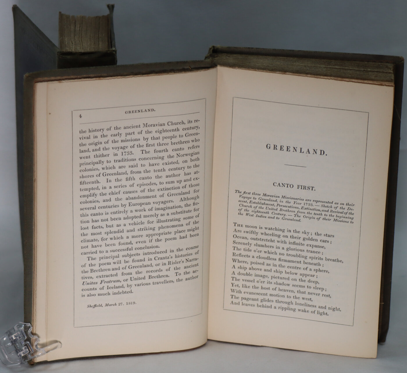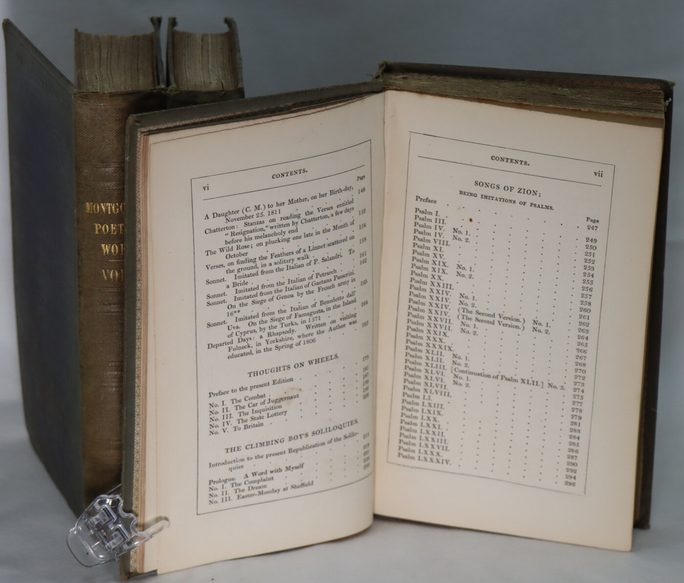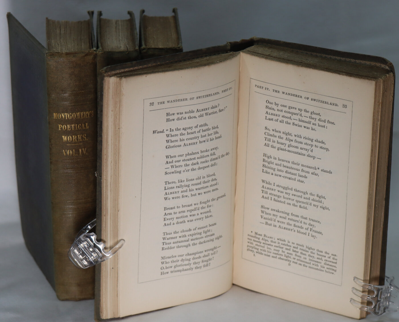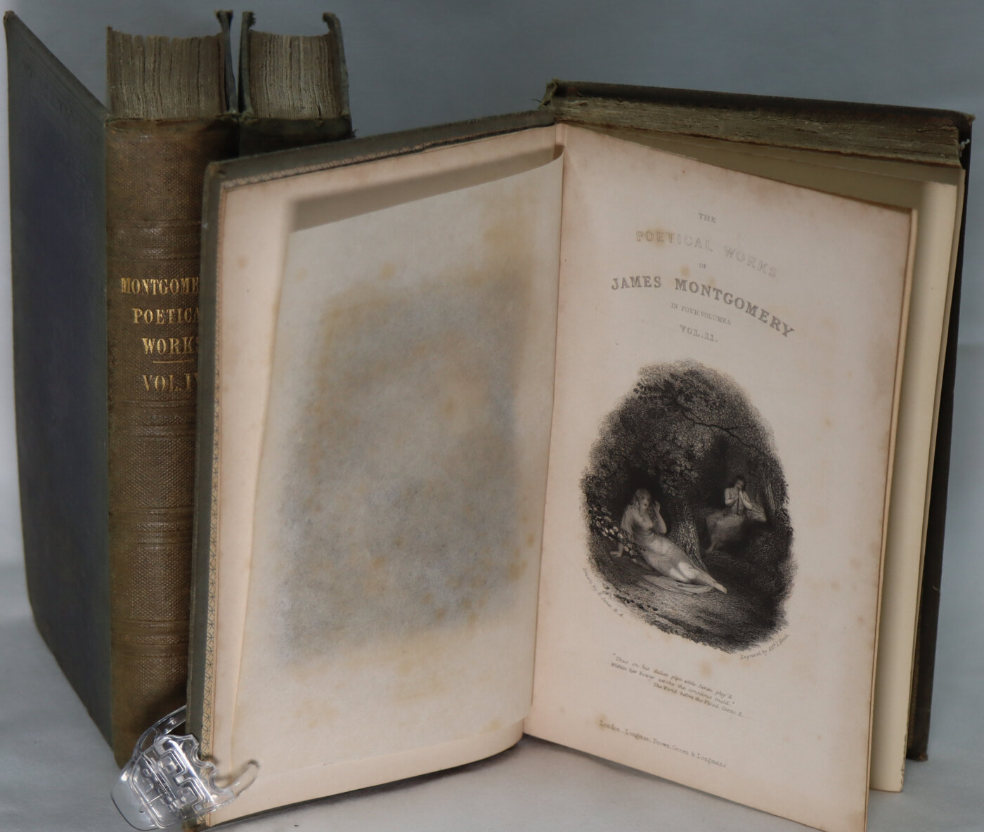 A lovely set of James Montgomery’s poetry, collected by himself, complete in four volumes with illustrations. Four volumes of The Poetical Works of James Montgomery collected by himself in the original publisher’s cloth bindings.A lovely set of works. Volume I includes Wanderer of Switzerland, The West Indies, Miscellaneous Poems, Prison Amusements. Volume II includes The World Before the Flood, Miscellaneous Poems, Thoughts on Wheels, The Climbing Bou”s Soliloquies, Songs of Zion. Volume III includes Greenland, Miscellaneous Poems, Narratives, Translations from Dante. Volume IV includes The Pelican Island, Miscellanies, Sacred and Scriptural Subjects. Internally, firmly bound. The pages are bright and clean. Very Good.