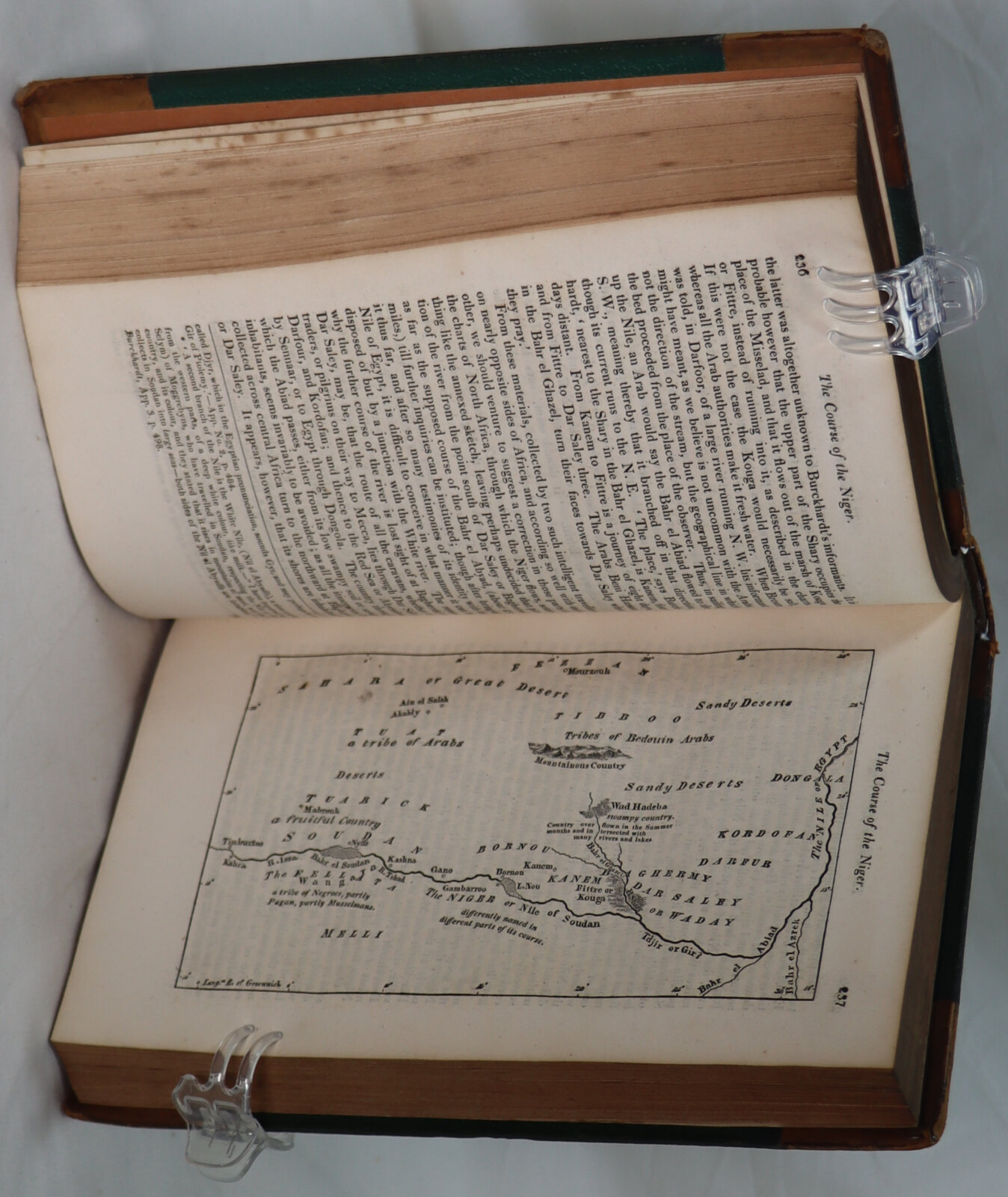Tan calf spine with raised banding, red title plate and gilt title. Green leatherette boards.