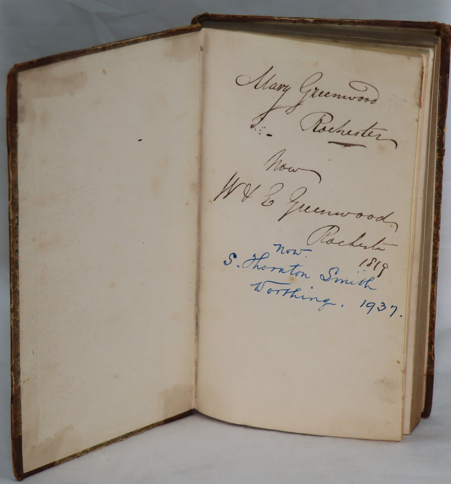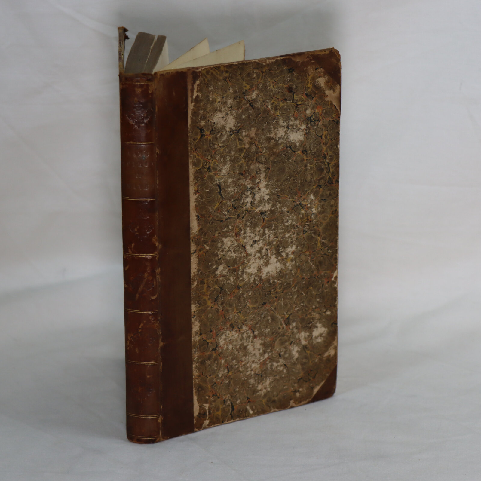 Tan calf spine with gilt banding with title. Brown marbled board.