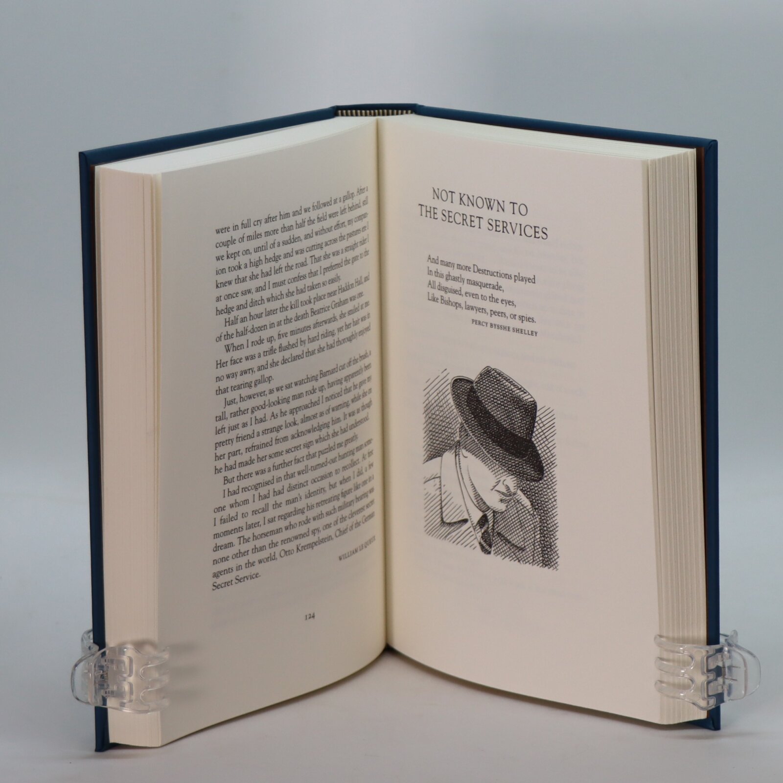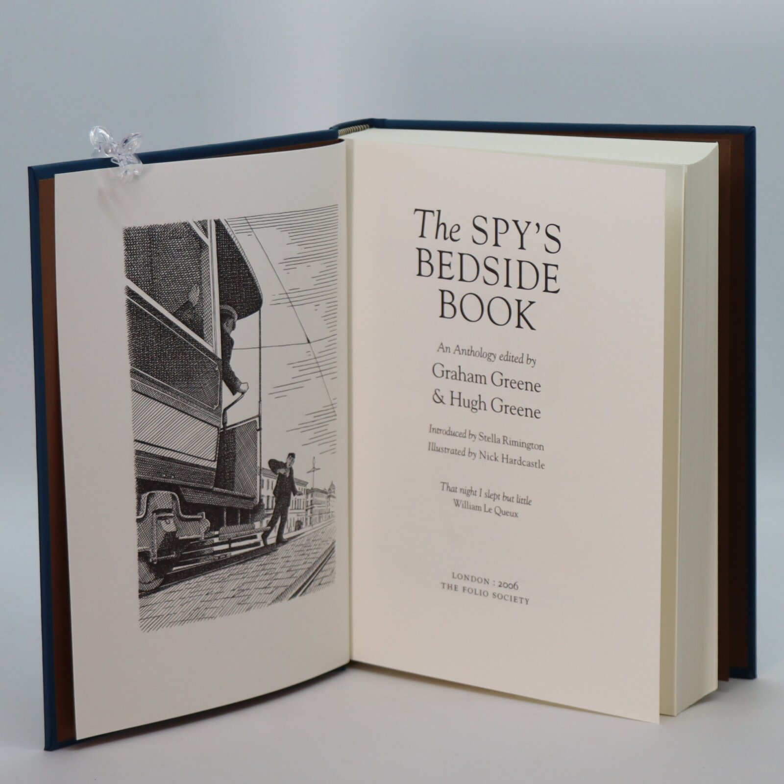 In a fitted box. Torquoise cloth binding with white title on the spine. White title with brown, black and white image of a figure alseep wearing a coat and trilby hat.