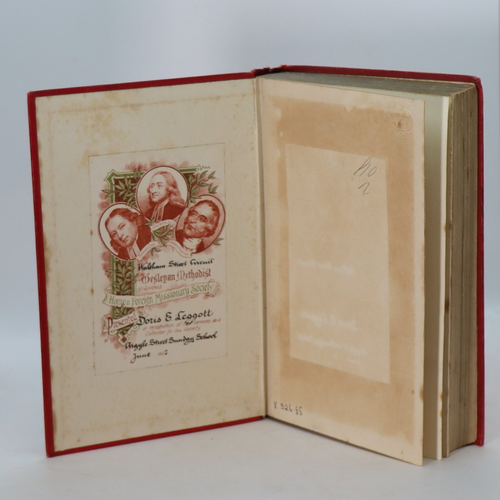Red cloth binding with black title and image of native village on the front board. Similar on the spine.