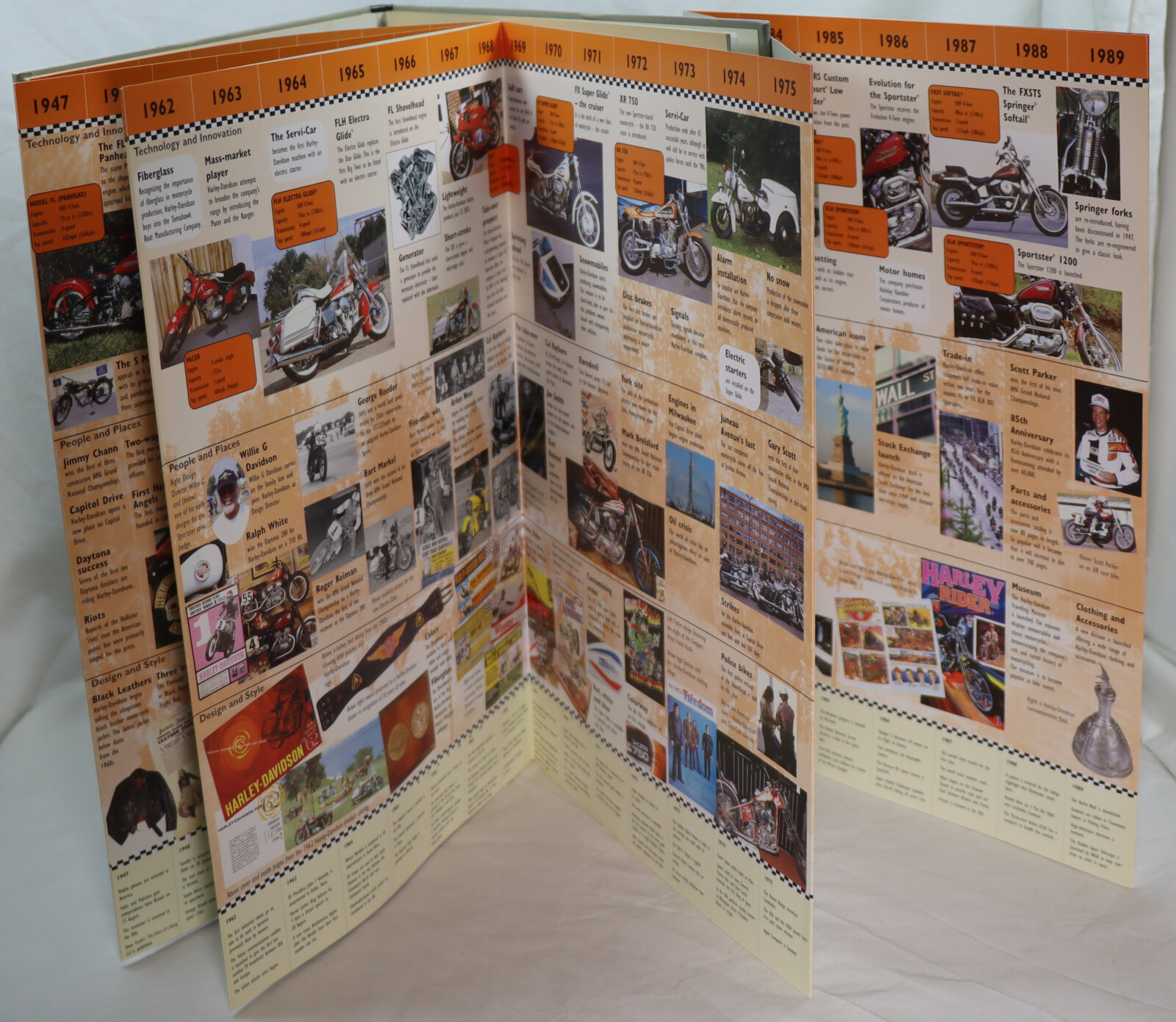Glossy black board binding with orange title motorbike images. Contents designed as a foldout timeline and information book section.